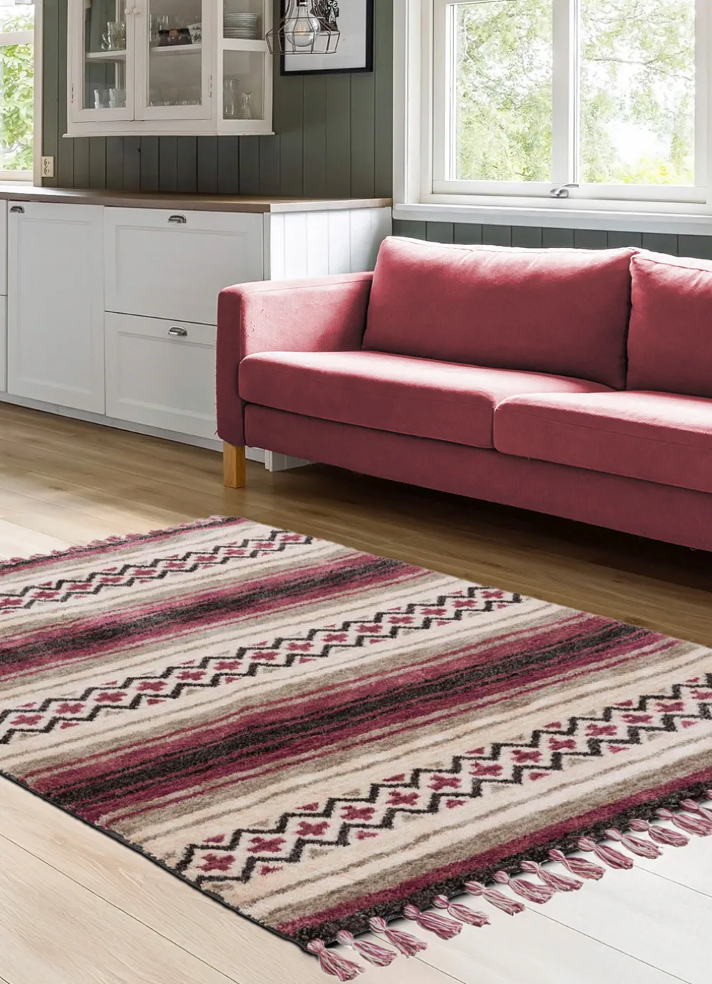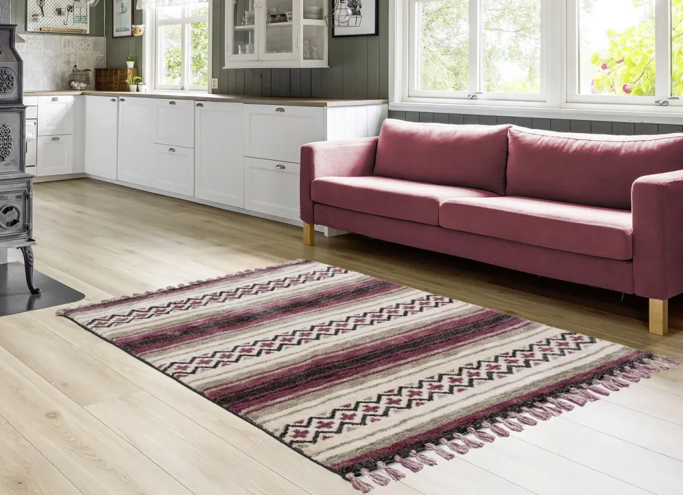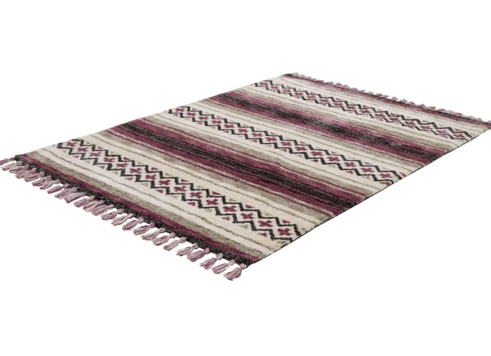 Mit einem Gewicht von ca. 2600 g/m² bietet er nicht nur eine angenehme Haptik, sondern auch eine exzellente Strapazierfähigkeit. Die stilvollen Fransen an den Enden verleihen dem Teppich eine zusätzliche dekorative Note.