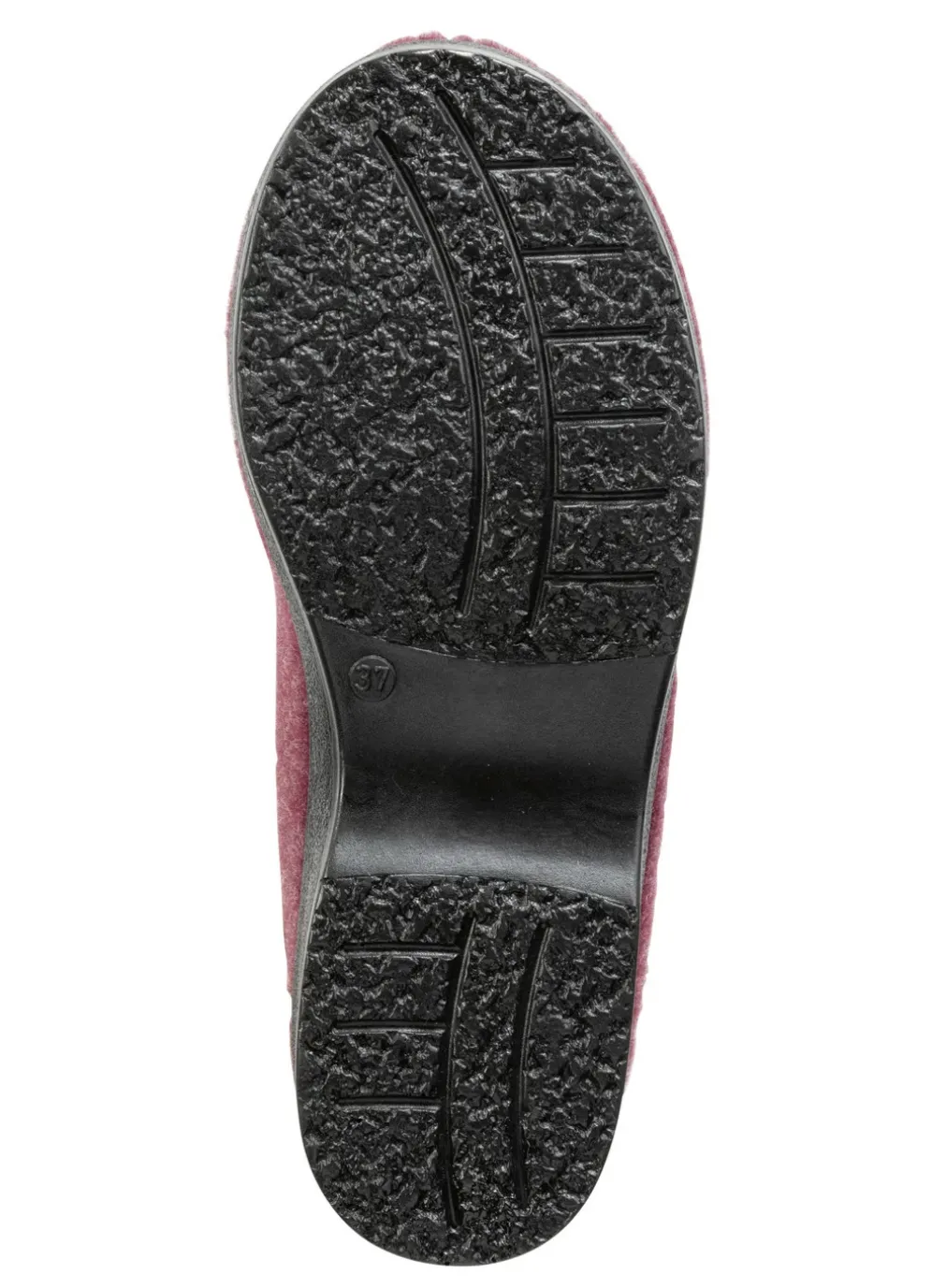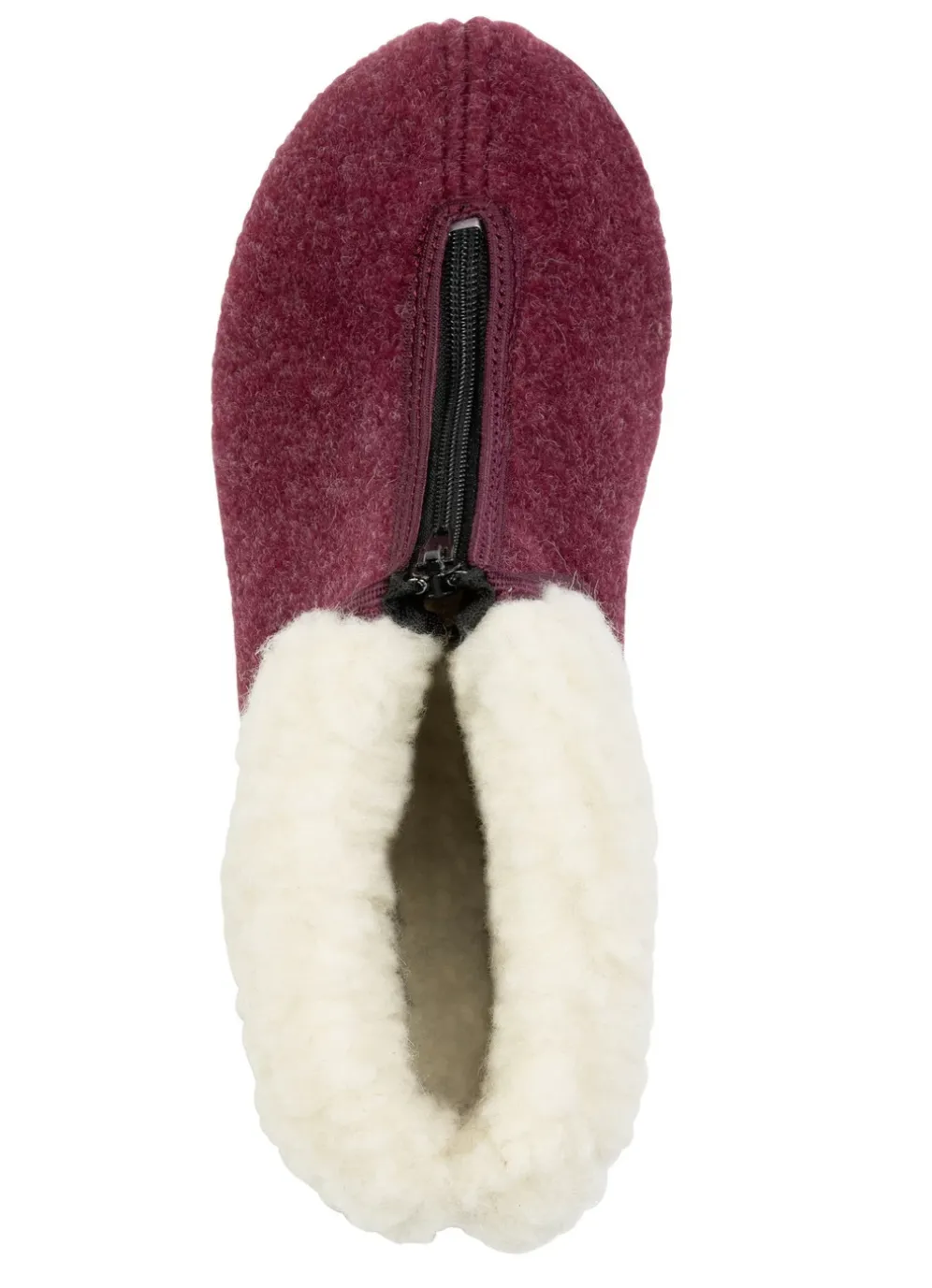 Haus-Stiefelette aus bordeauxfarbenem Filz, mit praktischem Front-Reißverschluss: Weite H, Plüschkragen, Warmfutter und Decksohlenbezug aus reiner Wolle, superleichte PU-Laufsohle, 20 mm Keilabsatz. Schafthöhe ca. 11 cm