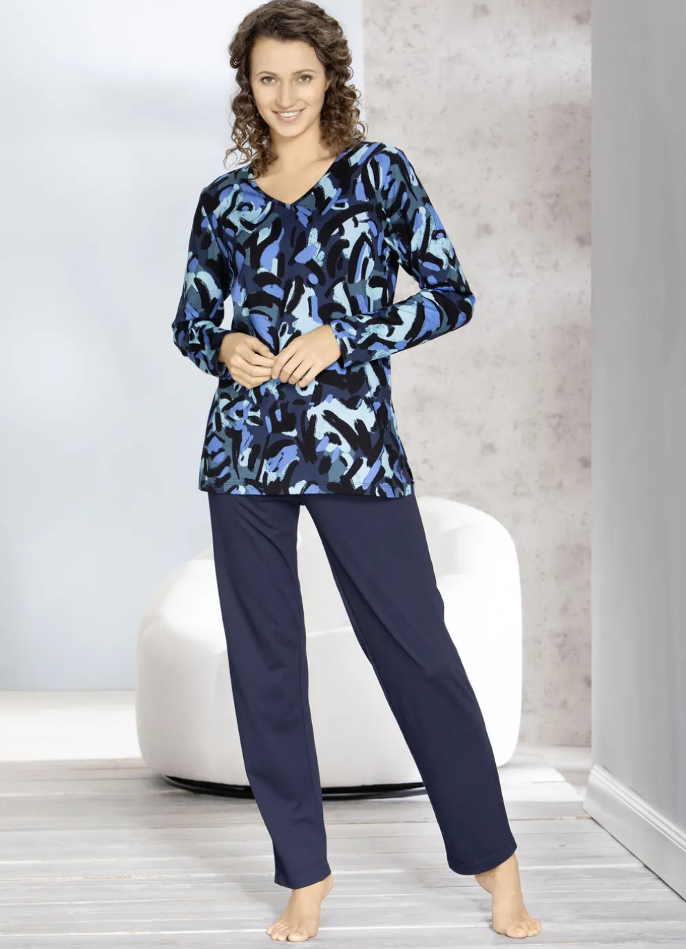 Schöner, marine-hellblau-türkis-schwarzer Hausanzug: Oberteil mit V-Ausschnitt, langen Ärmeln sowie zwei Seitenschlitzen.