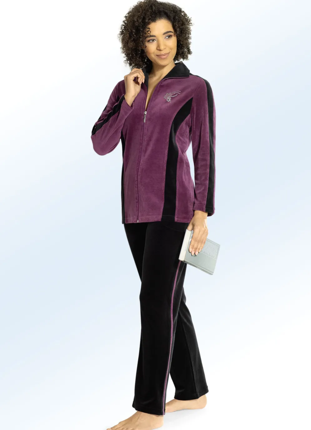 Exquisiter COMODO-Hausanzug: Oberteil mit durchgehendem Reißverschluss, Strasssteinzier im Vorderteil sowie Kontrasteinsätzen an den Wiener Nähten und an den Ärmeln.
