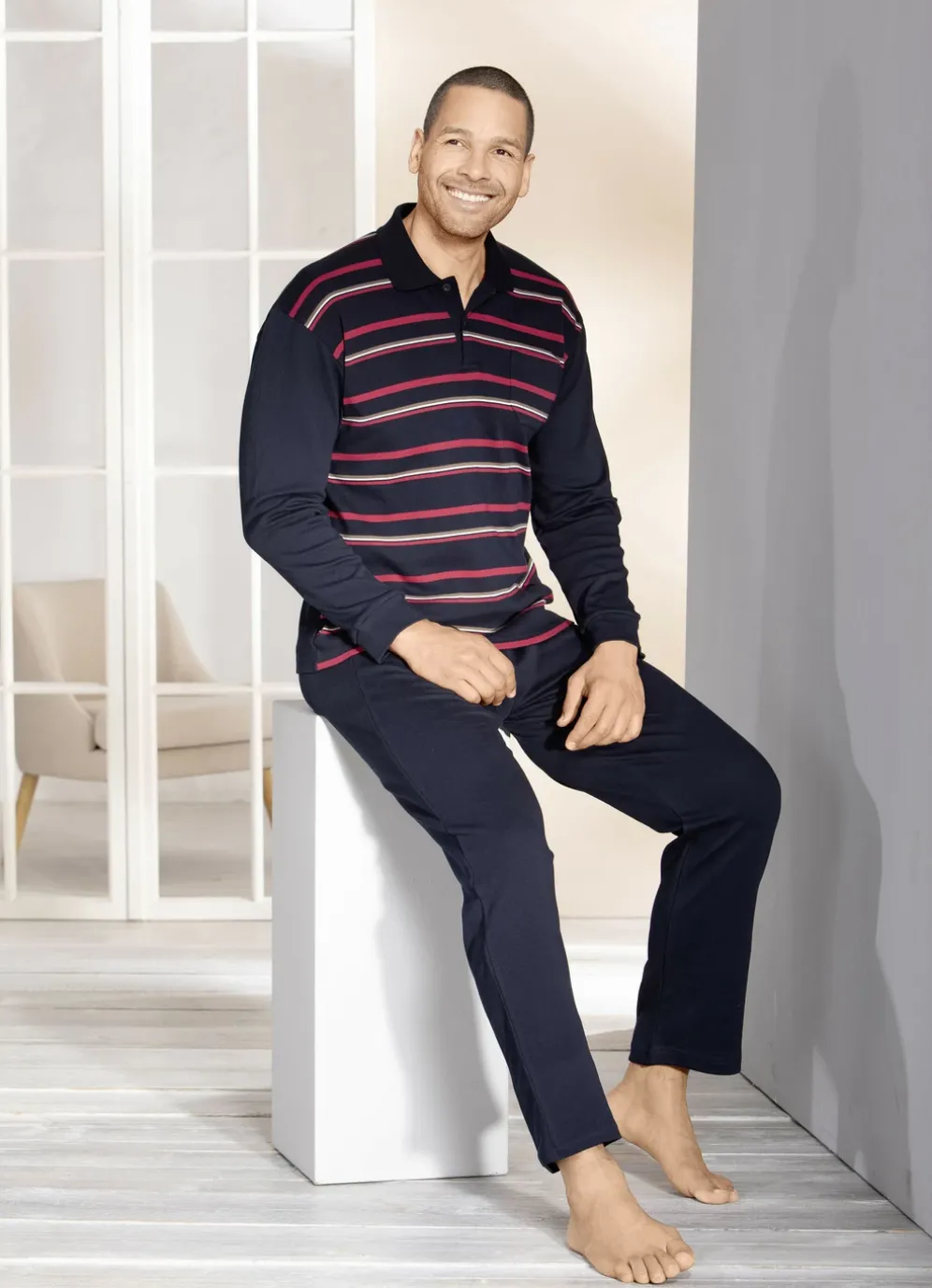 Sportiver Hausanzug in Marine-Rot-Weiß-Braun! Das Oberteil präsentiert sich mit angesagtem Streifendessin im Vorderteil, Polokragen und einer kurzen Knopfleiste.