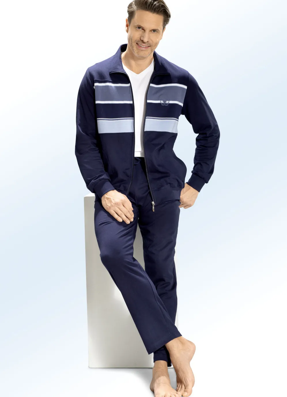 Herrlicher Hausanzug in Marine-Hellblau-Blau-Weiß! Das Oberteil mit garngefärbtem Streifendessin und platziertem Stickereimotiv im Vorderteil, durchgehendem Reißverschluss sowie zwei Seitennahttaschen.
