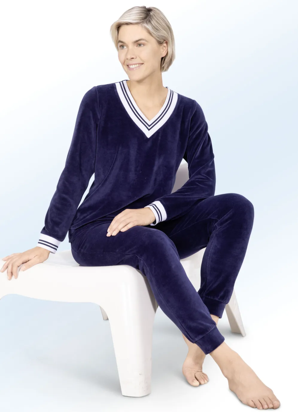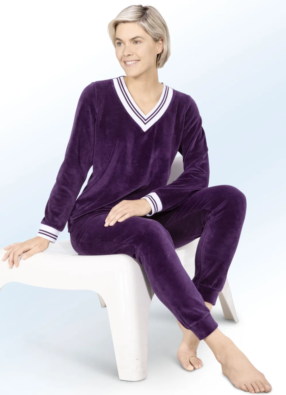 Toller Laurina-Hausanzug! Oberteil: weißer, elastischer Rippbund mit Kontraststreifen an den langen Ärmeln und am V-Ausschnitt.