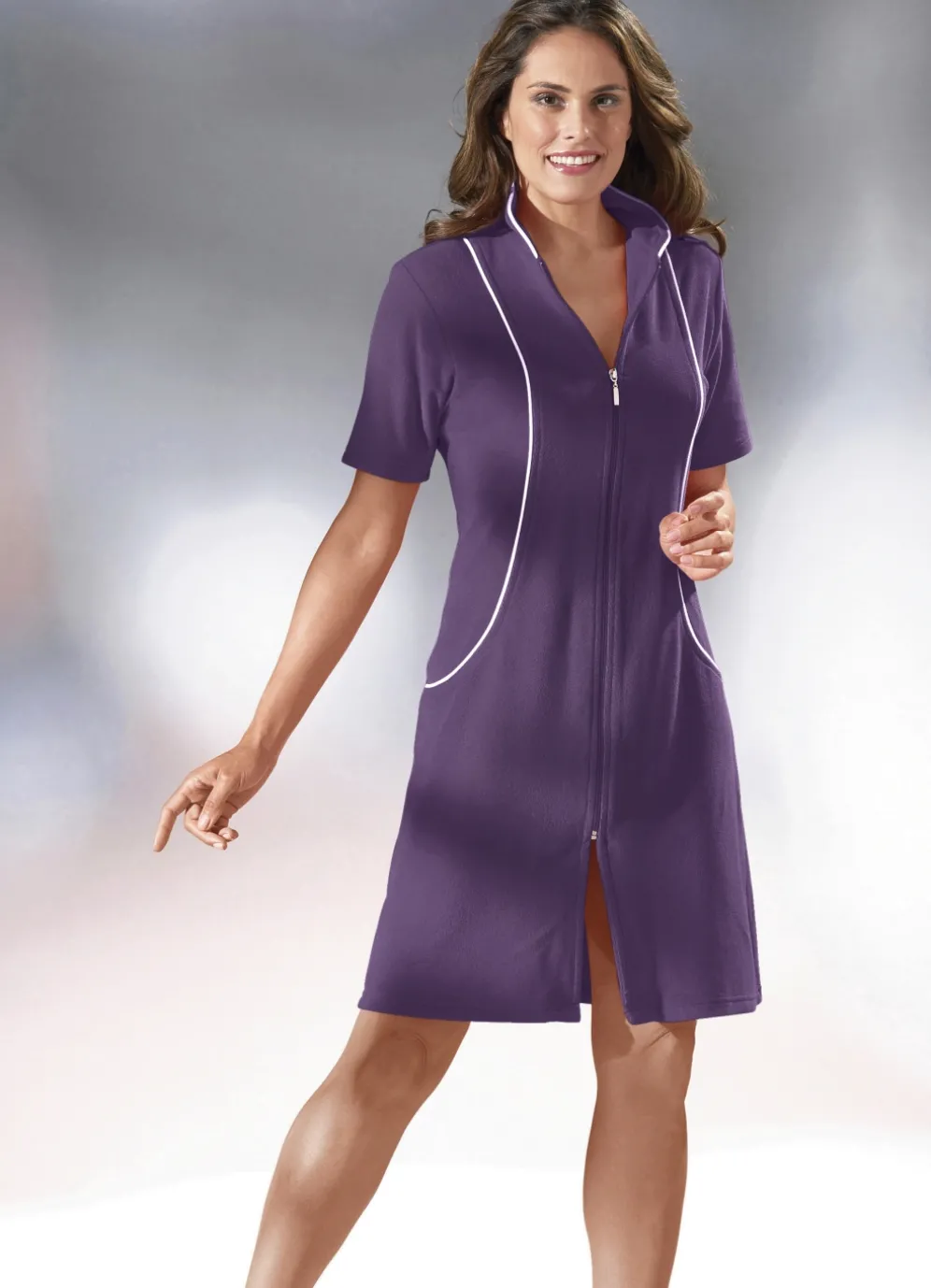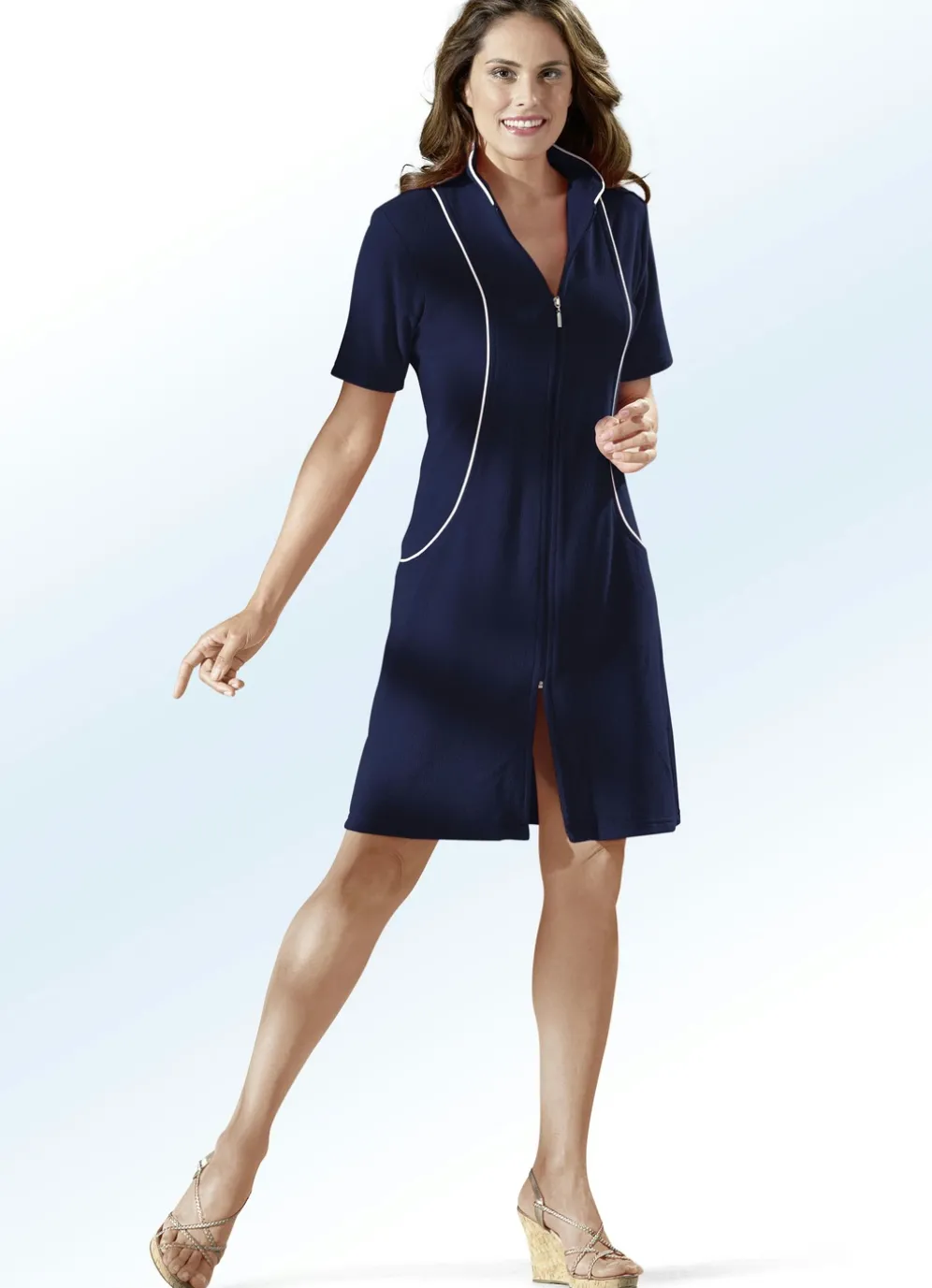 Sportives Hauskleid in Knie umspielender Form, mit durchgehendem Reißverschluss sowie dekorativer, weißer Kontrastpaspelierung im Vorderteil und am Kragen.