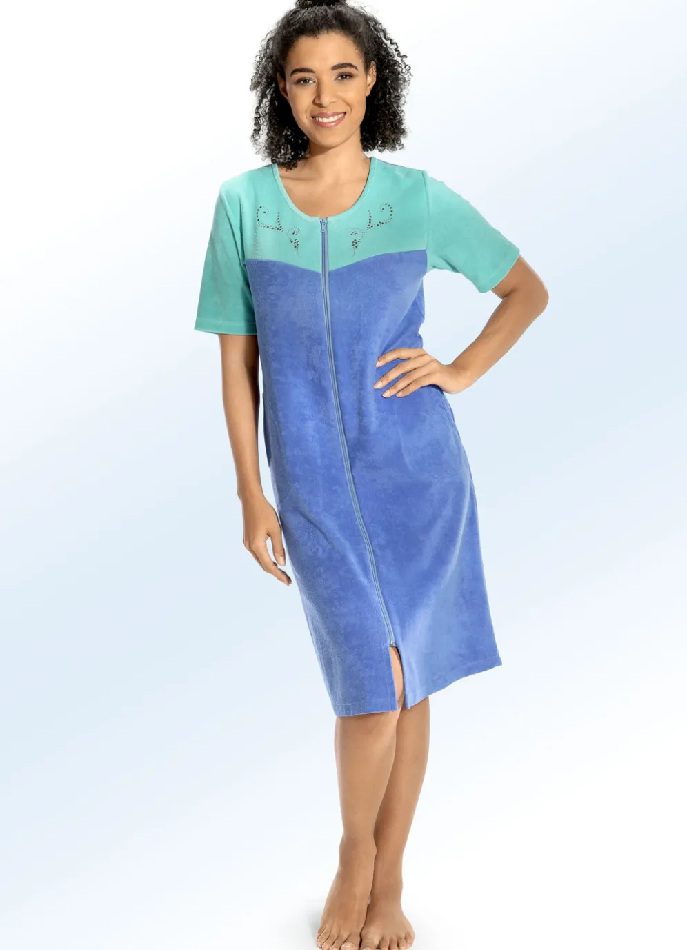 Knielanges Hauskleid in Hellblau-Mint: runder Halsausschnitt, durchgehender Reißverschluss, Schmucksteinzier im Vorderteil, kurze Ärmel, zwei Seitennahttaschen.