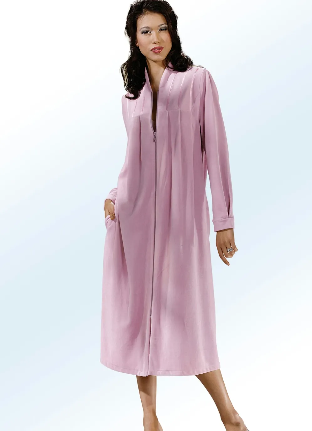 Geschmackvoller, wadenlanger Hausmantel von COMODO mit durchgehendem Reißverschluss, Kelchkragen, Satinbandzier und dezenten Raffungen an der Vorderpasse sowie zwei Seitennahttaschen.