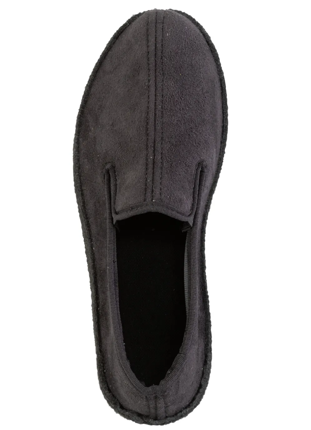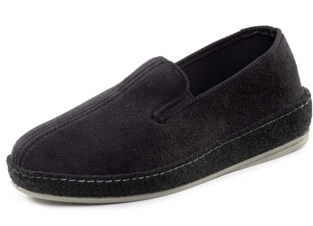 Hausschuh aus schwarzem Veloursmaterial, mit seitlichen Gummizügen: Futter und Decksohle aus Textil, Filzschalensohle sowie TR-Laufsohle