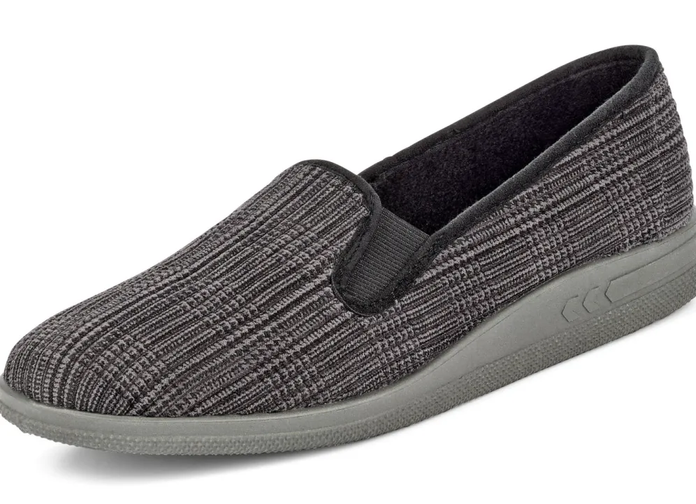 Karierter Hausschuh in Anthrazit, aus weichem, kaschiertem Cord-Textilmaterial: zwei seitlich eingesetzte Gummizüge, anatomisch geformtes, wohlduftendes Fußbett mit ätherischen Ölen sowie PVC-Laufsohle