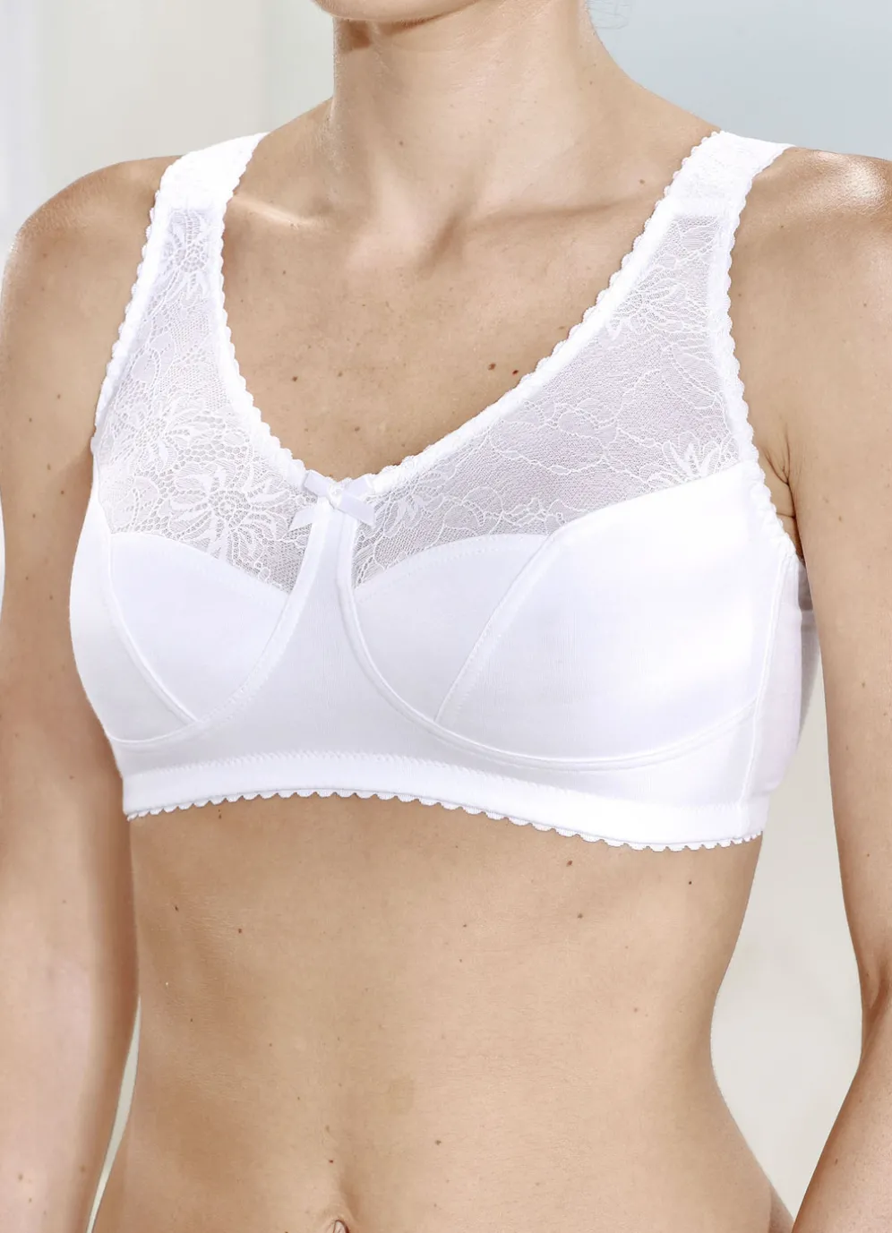 Hautsympathischer, weißer BH mit unterlegtem Vorderteil, zusätzlicher, seitlicher Cupverstärkung, elastischer Spitze am Dekolleté sowie im Schulterbereich weich gepolsterten, verstellbaren Stretchträgern.