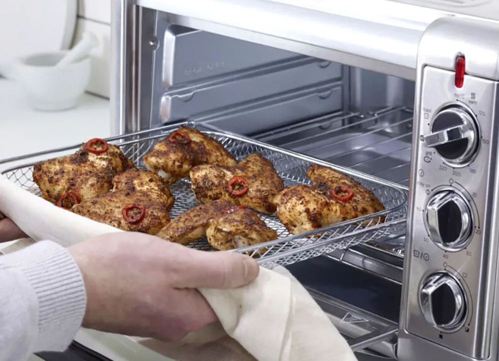 Heißluftfritteuse, Backofen, Grill, Toaster und Warmhaltefunktion. Mit Ober und Unterhitze sowie Heißluft für gleichmäßige Backund Bratergebnisse. 49% energieeffizienter (*verglichen mit einem konventionellen Backofen beim Backen von 400 g gefrorenen Pommes frites bei 213 °C), 4x schnellere Aufheizzeit (**verglichen mit der Aufheizzeit auf 220 °C in einem konventionellen Backofen). 20-Liter- Garraum auch perfekt geeignet für Pizzen und Kuchenformen bis ø 30 cm, für ein ganzes Hähnchen oder 6 Toastscheiben.