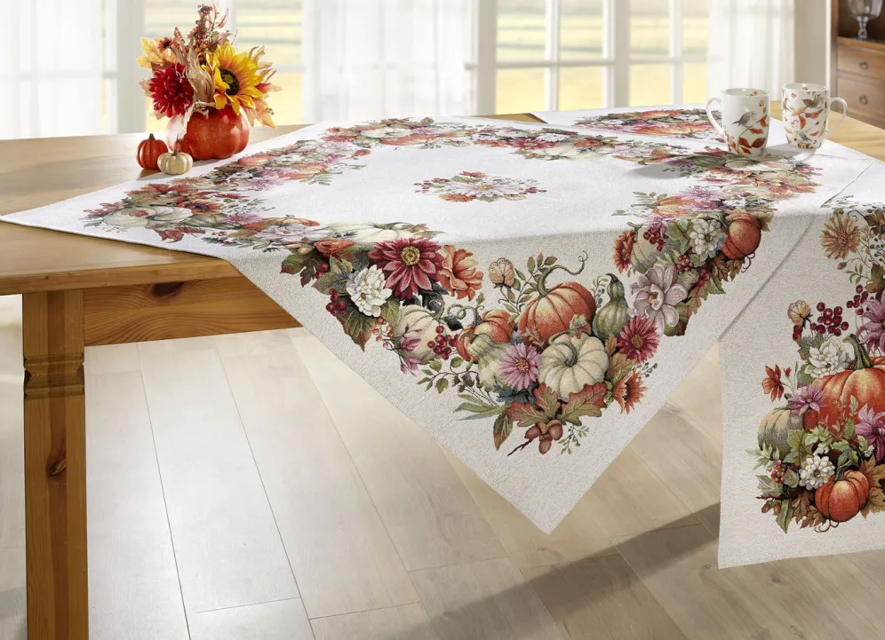 Ein herbstliches Arrangement aus Kürbissen und buntem Blattwerk ziert diese detailreich dessinierte Tisch- und Raumdekoration. Kissenbezug mit Reißverschluss. Qualität: Gobelin aus 68% Polyester und 32% Baumwolle. Waschbar bis 30 °C