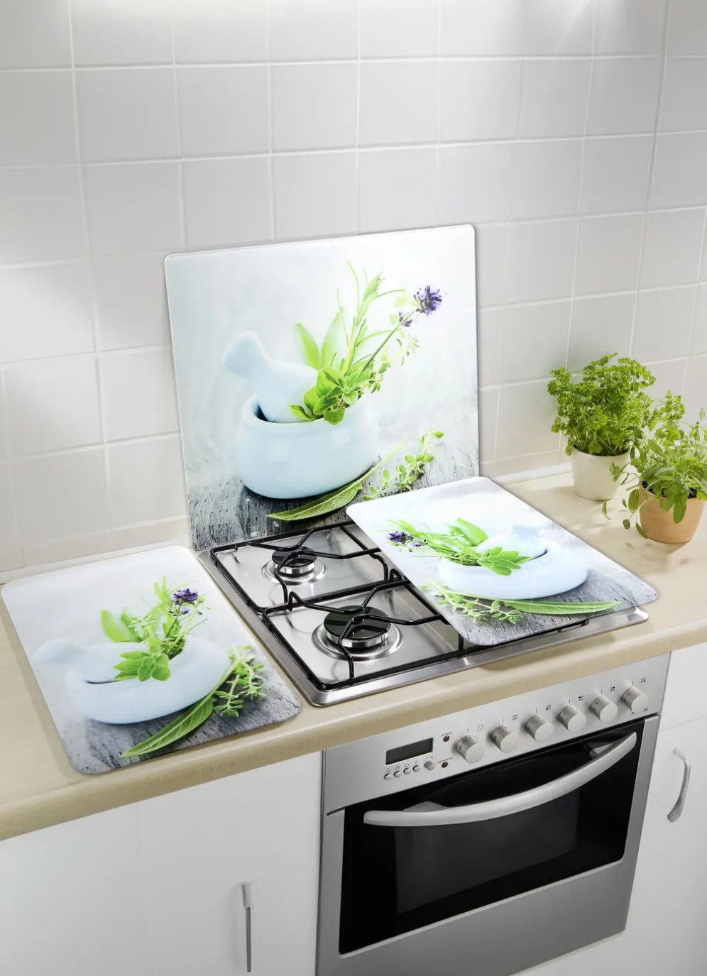 Herd-Abdeckplatten im 2er-Set aus Glas in der Ausführung Kräutergarten und in Kräutergarten.