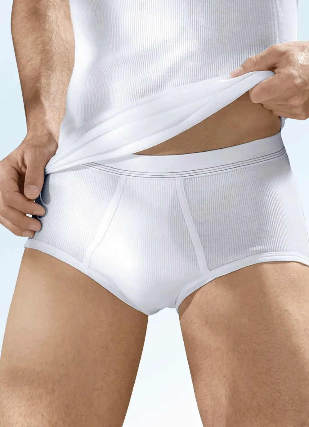 Hautsympathischer, weißer „Hermko“-Slip mit Kontraststreifen am Softbund und paspeliertem Eingriff.