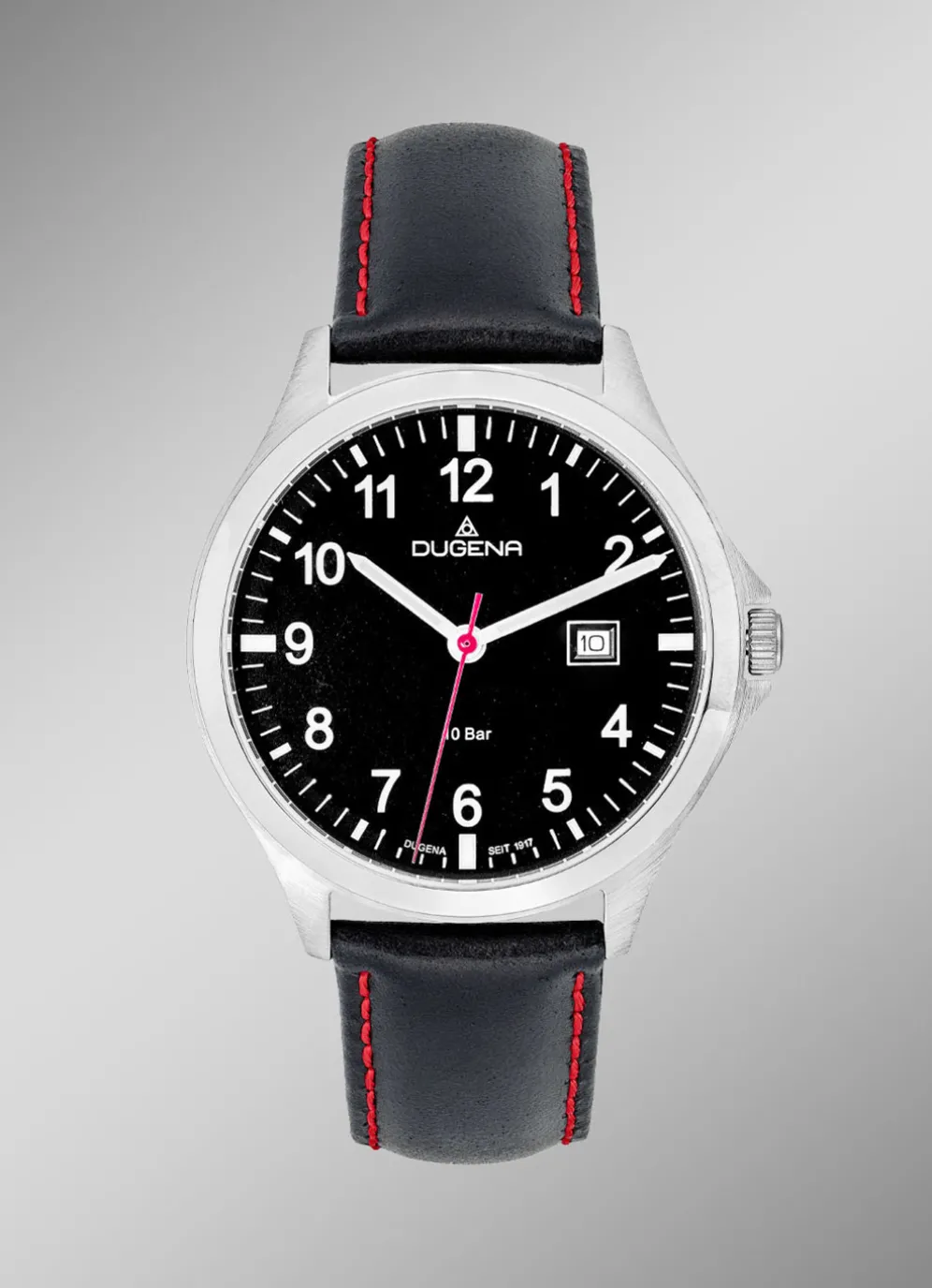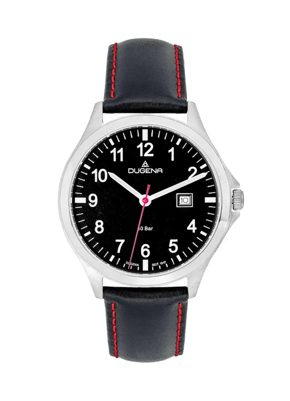 Klassische Quartz-Herrenuhr mit einem Edelstahlgehäuse und einem schwarzem Lederband mit roten Ziernähten und Dornschließe. Zudem hat die Herrenuhr ein Datums-Anzeige, floureszierende Zeiger und als Highlight einen roten Sekundenzeiger. Die Uhr ist 10 bar wasserdicht und hat einen Gehäusedurchmesser von 41 mm.