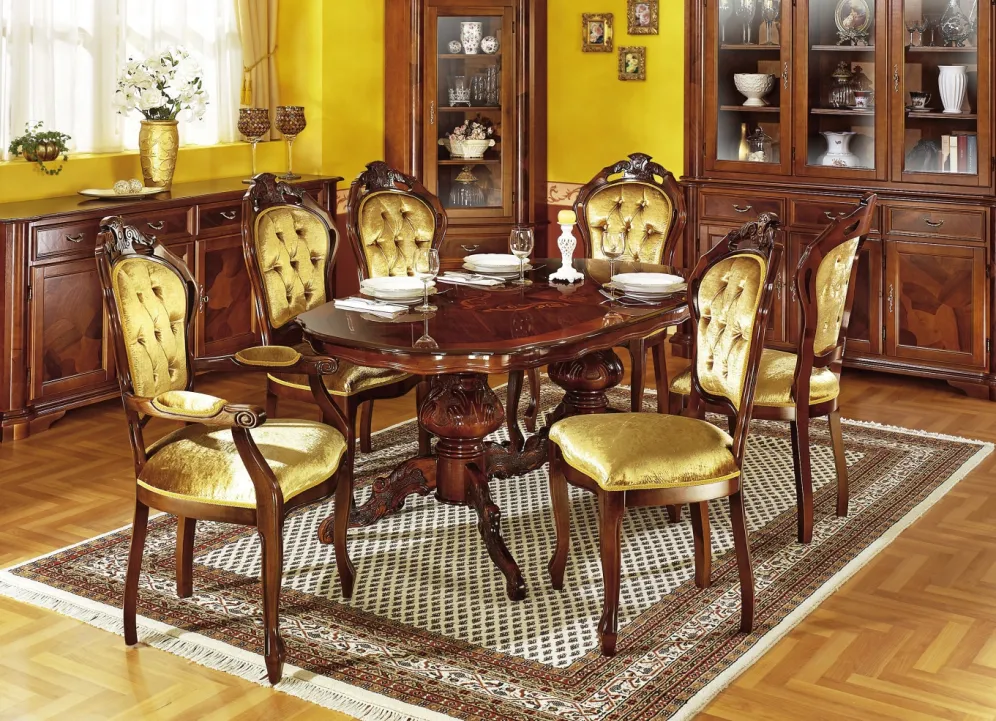Der neue Mittelpunkt in Ihrem Esszimmer: Herrlicher Esstisch in Nussbaum, der mit sehr hochwertig gearbeitetem, reichhaltig verziertem Tischgestell mit verschnörkelten Schnitzereien sowie schönen, wertvollen Intarsien in der glänzenden Tischplatte gearbeitet wurde. Mit Aufbau-Anleitung, zur einfachen Endmontage.