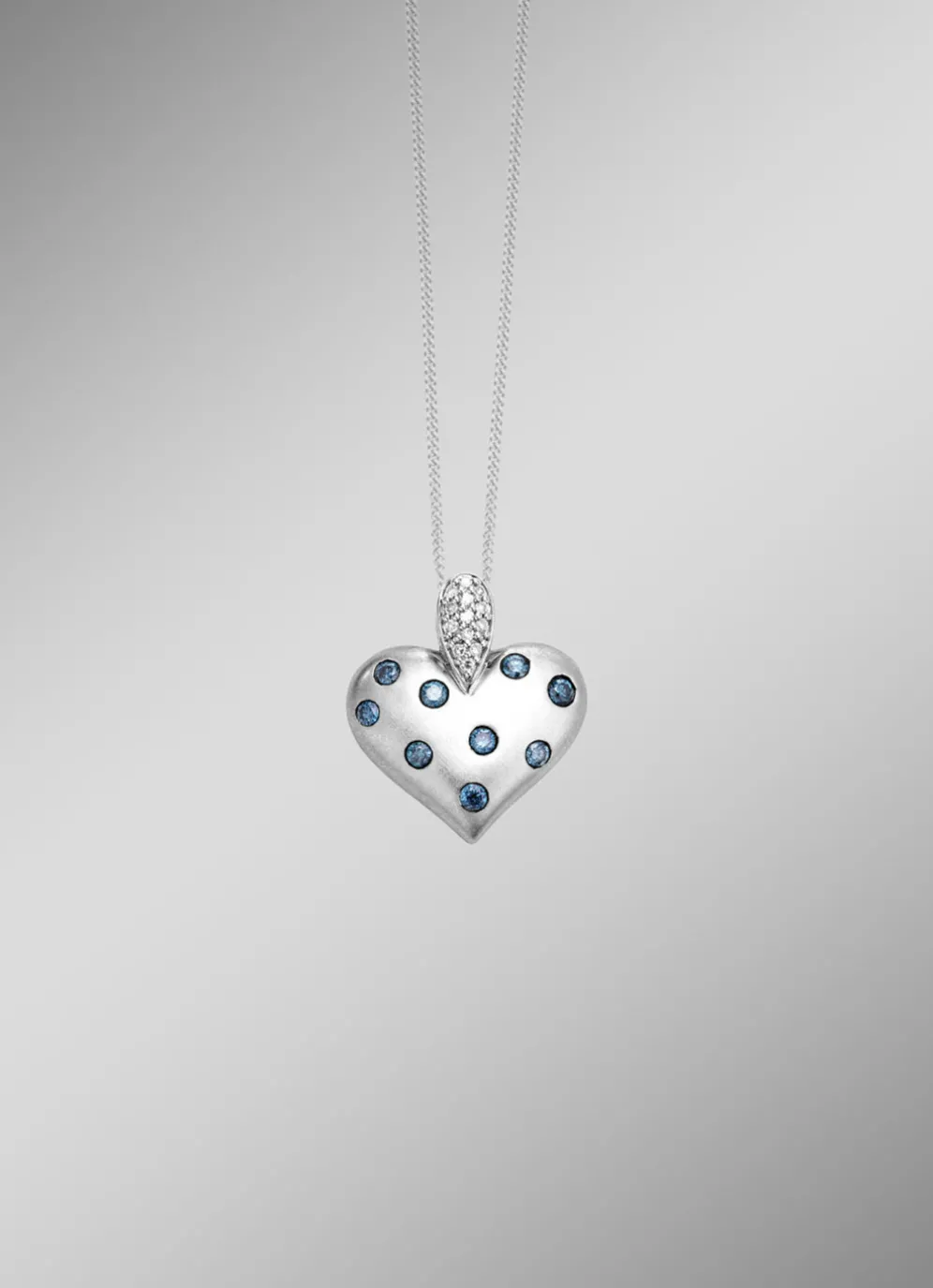 Herzenszauber in Weißgold. Ein Schmuckstück, das Emotionen weckt – dieser elegante Herzanhänger aus feinem Weißgold 585 vereint zeitlose Schönheit mit edler Raffinesse. Die mattierte Oberfläche verleiht ihm eine sanfte, moderne Ausstrahlung, während 9 strahlend blaue Brillanten und 13 funkelnde weiße Diamanten mit insgesamt ca. 0,25 ct. seine Eleganz vollenden.