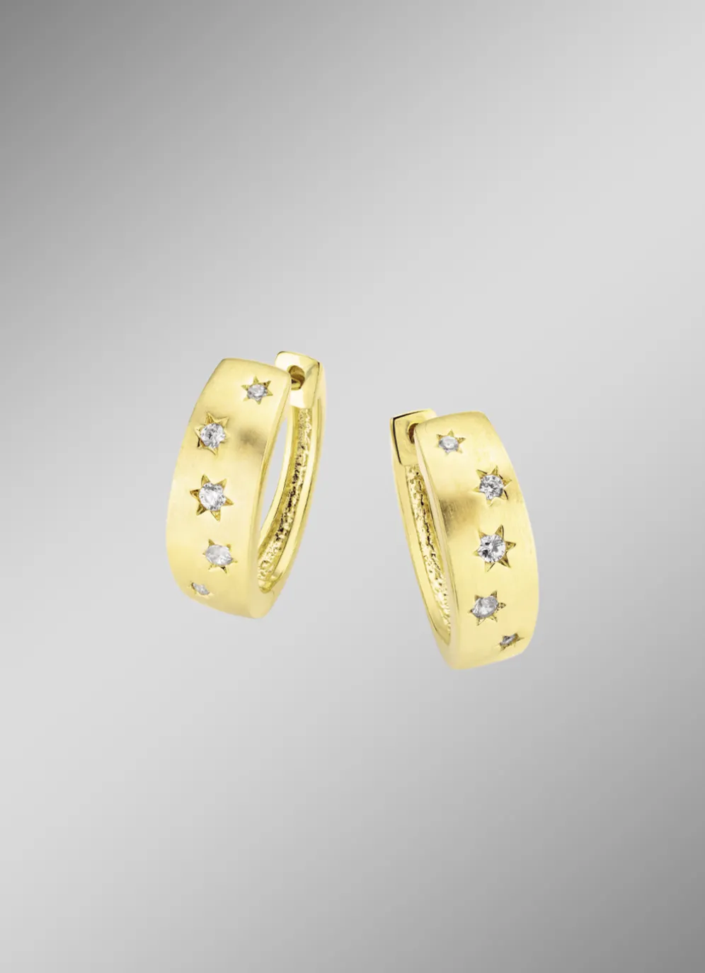 Ein hinreißendes Paar Creolen in Silber 925/- fein, vergoldet. Die sternförmigen synth. Zirkonia bringen sie zum Strahlen. So verleihen diese wunderschönen 17×15 mm großen Schmuckstücke feminine Eleganz.