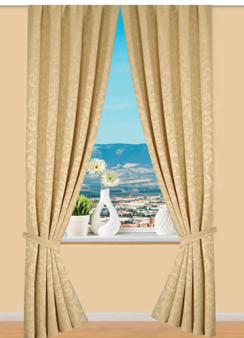 Hochwertige Jacquard Übergardinen-Garnitur in Größe 899 (2er-Pack Raffhalter, 70 cm) und in Beige.
