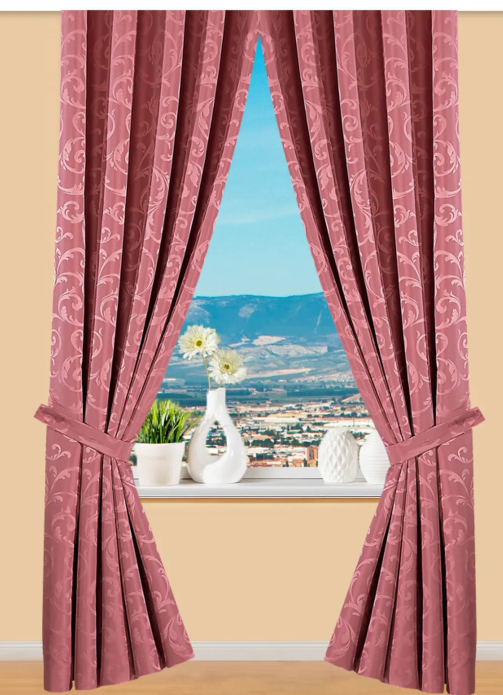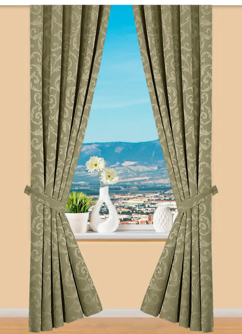 Hochwertige Jacquard Übergardinen-Garnitur mit edler Ranken-Musterung und dezentem Glanz. Mit Universalschienenband. Qualität: 100% Polyester. 2 Schals in einer Packung. Maße pro Schal, Preise pro Garnitur