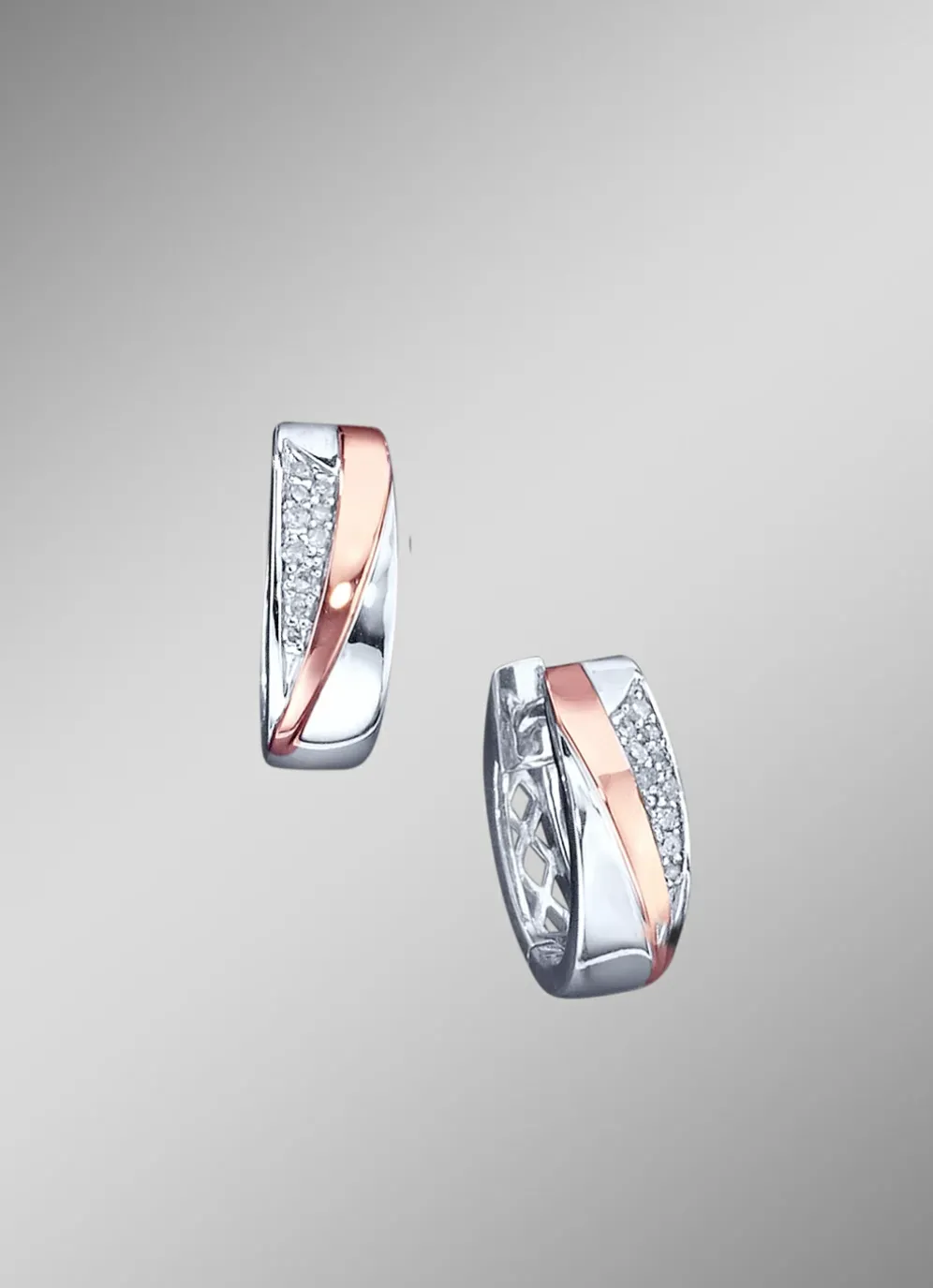 Feminine Klappcreolen, wahlweise aus Weiß/Rotgold 585/- fein oder Weiß/Rotgold 375/- fein, mit 20 funkelnden Diamanten, Weiß, Piqué 2. Die hochwertigen Schmuckstücke sind 12 mm lang. Der hochglänzende Ohrschmuck lässt sich schön mit anderen Schmuckstücken kombinieren.