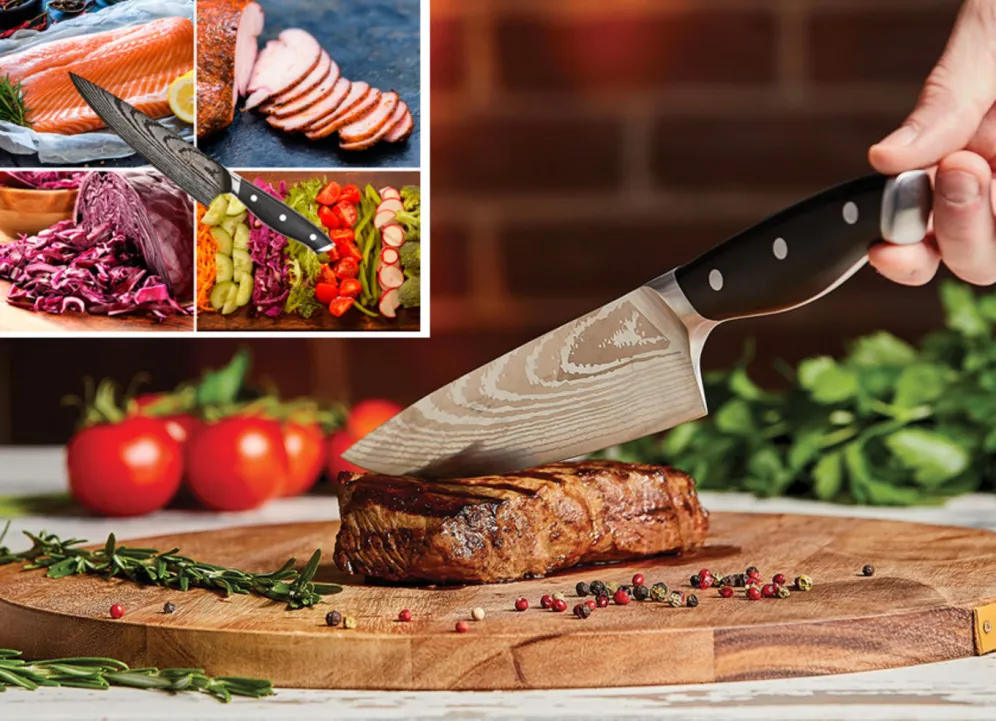 Dieses hochwertige Chefmesser aus erstklassigem Edelstahl mit doppelt abgeschrägter Klinge und ergonomisch geformten Griffen. Dreifach genietet. Robuste Qualität – ersetzt Santoku-, Brot-, Käse-, Entbein-, Schälmesser uvm.