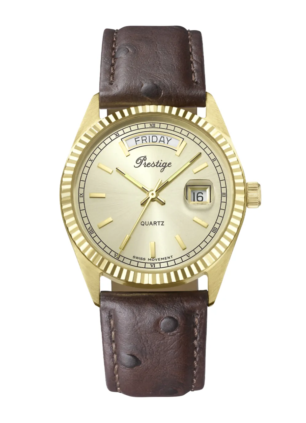 Das Gehäuse der Prestige-Quartz-Herrenuhr ist aus Gold 585/- fein gefertigt. Die Uhr verfügt über ein braunes Lederband mit Straußen-Prägung und Dornschließe. Das Mineralglas schützt das Zifferblatt vor Kratzern und Beschädigungen. Die Datums-Anzeige zeigt Ihnen immer den aktuellen Tag an. Die zusätzliche Wochentags-Anzeige hilft Ihnen, den Überblick zu behalten. Die Uhr hat einen Durchmesser von 35 mm. Die Uhr ist spritzwassergeschützt, sodass Sie sich keine Sorgen machen müssen, wenn Sie mal nass werden.