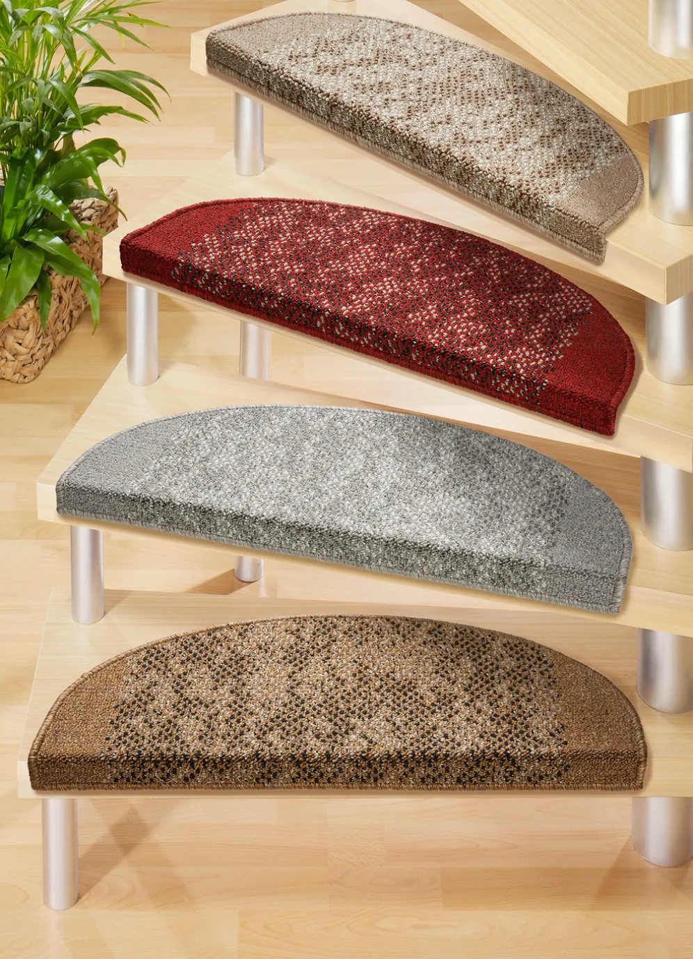 mit zeitlosem Dessin fügen sich harmonisch in jedes Wohnambiente ein und bieten eine angenehme Kombination aus Komfort und Funktionalität. Dank der rutschfesten Latex-Rückseite bleiben sie sicher an ihrem Platz und sorgen für ein stabiles Laufgefühl auf jeder Stufe.