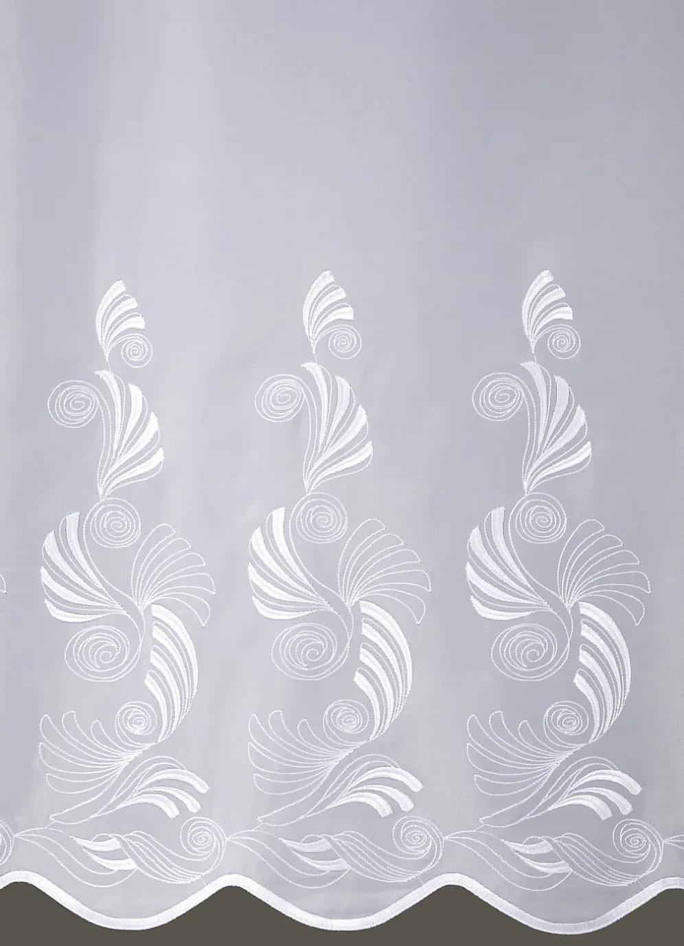 Einen fantastischen Ausblick beschert Ihnen dieser herrliche Blumenfensterstore mit echter Plauener Stickerei. Mit gebogtem Abschluss und Universalschienenband. Die Qualität: Voile aus 100% Polyester. Waschbar bis 30° Schonwäsche. Masse: jeweils HxB in cm
