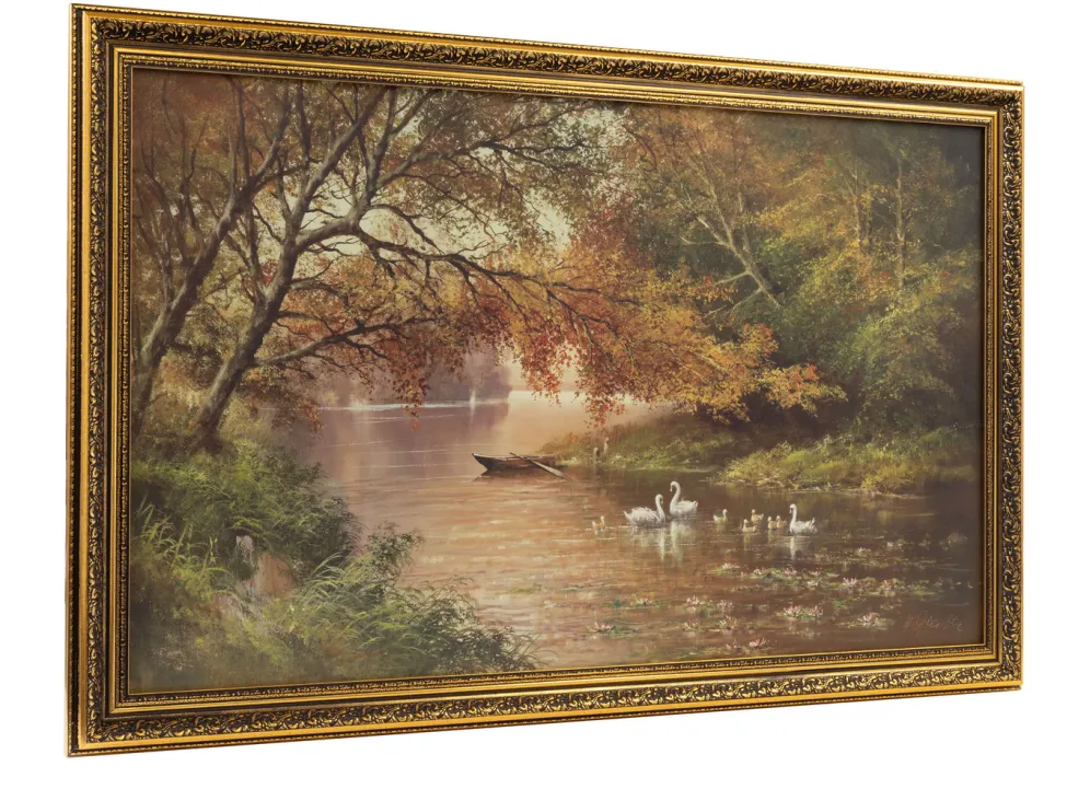 Dieses wunderschöne Bild vom Künstler Helmut Glaßl zeigt eine wunderschöne herbstliche Flusslandschaft mit einer Schwanenfamilie und einem Ruderboot. Es trägt den passenden Titel „Swanfamily in Autumn“.