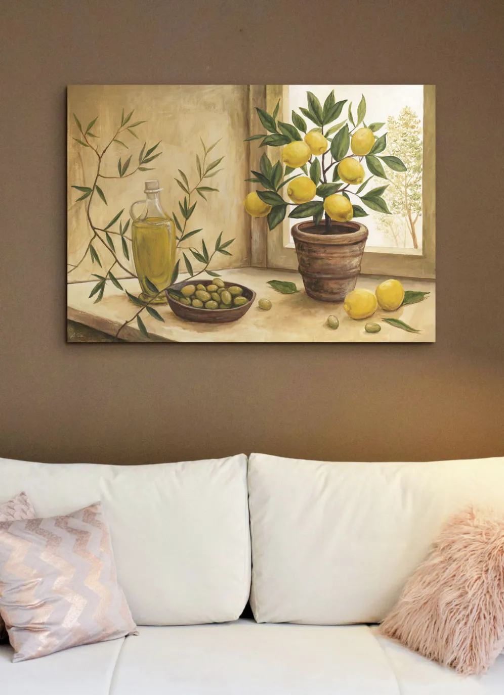 Vom Künstler S.A. mit dem passenden Titel „Oliven und Zitronen“ gestaltet. Hochwertiges Leinwandbild auf Keilrahmen gezogen. Mit Aufhänge-Vorrichtung. Maße: B100xH70xT1,8 cm
