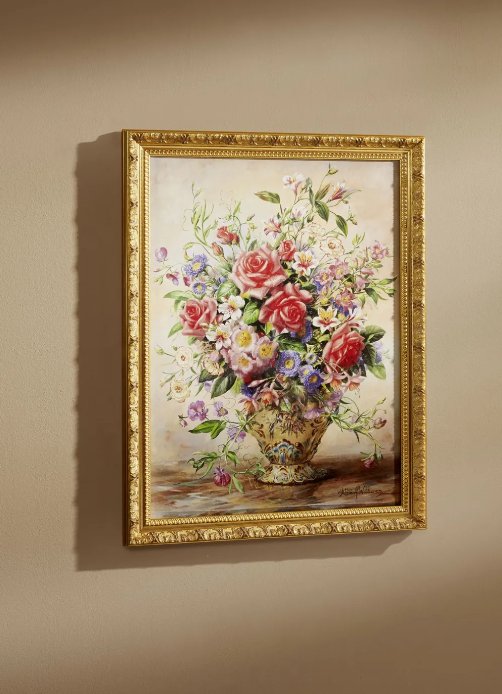 Ein Traum eines bunten Rosenstraußes in einer goldfarbenen Vase präsentiert sich auf diesem Bild des Künstlers A. Williams. Mit dem Titel „Hommage an die Queen Mother“. Hochwertiges Leinwandbild auf Holzfaserplatte gezogen. Mit handvergoldetem Blattgoldrahmen. Mit seidenmatter Oberflächenschutzversiegelung und Zertifikat. Maße: B59xH79xT4 cm