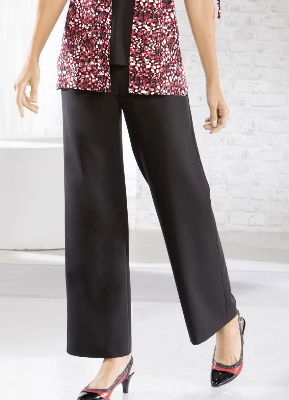 Attraktive Hose in Palazzo-Form: weites Bein, bequeme Schlupfform, Dehnbund rundum sowie Gürtelschlaufen. Innenbeinlänge ca. 78 cm, Fußweite ab 52 cm.