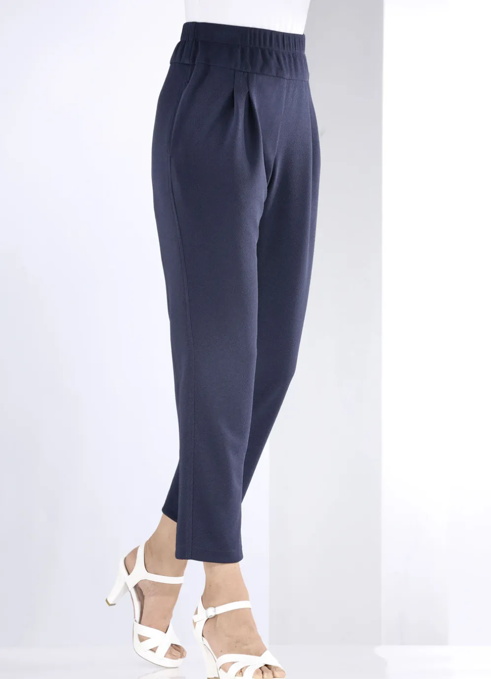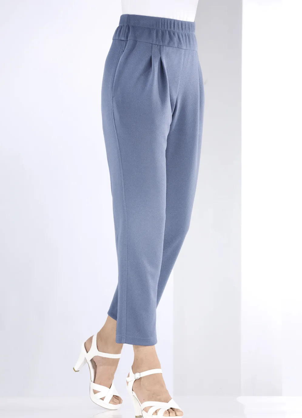 Ansprechende, knöchellange Hose in bequemer Schlupfform: Dehnbund rundum, Abnäher unterhalb des Bundes, Seitentaschen sowie figurgünstige Teilungsnähte im Rückteil. Innenbeinlänge ca. 71 cm, Fußweite ab 38 cm.