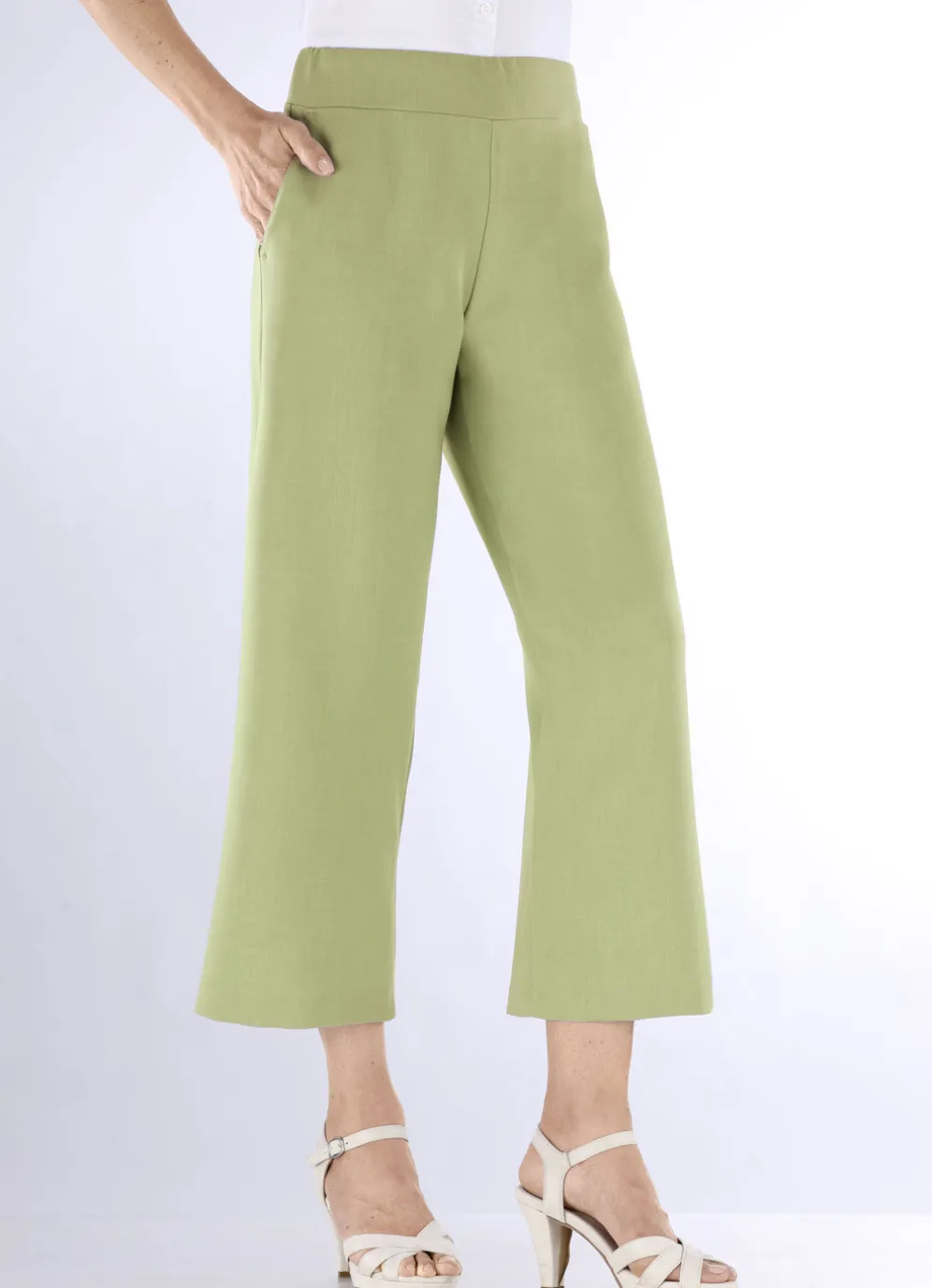 Angesagte Hose in modisch verkürzter Länge sowie bequemer Schlupfform mit elastischem Formbund rundum sowie Seitentaschen. Innenbeinlänge ca. 65 cm, Fußweite ab 58 cm.