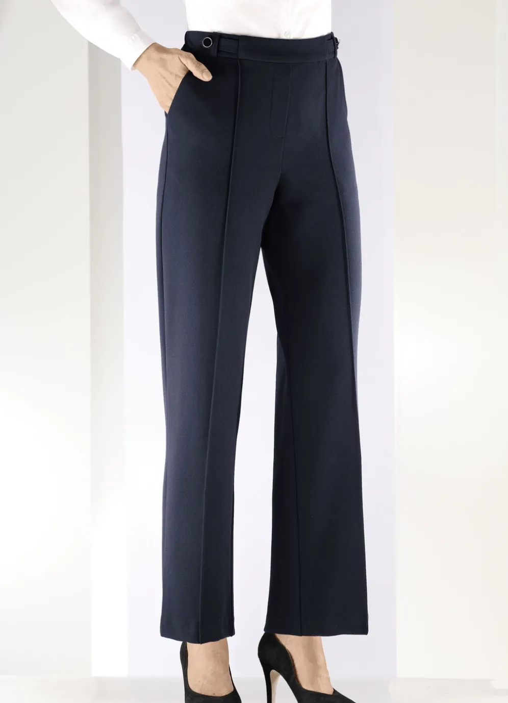 Fabelhafte Hose in modischer Weite: bequeme Schlupfform mit rückwärtigem Dehnbund und vorderer glatter Bundverarbeitung, Gürtelschlaufen, Zierriegel mit dekorativen Knöpfen vorne am Bund, angedeutete Reißverschluss-Zierblende, abgesteppte Biesen, die für eine streckende Optik sorgen sowie Seitentaschen. Innenbeinlänge ca. 78 cm, Fußweite ab 46 cm.