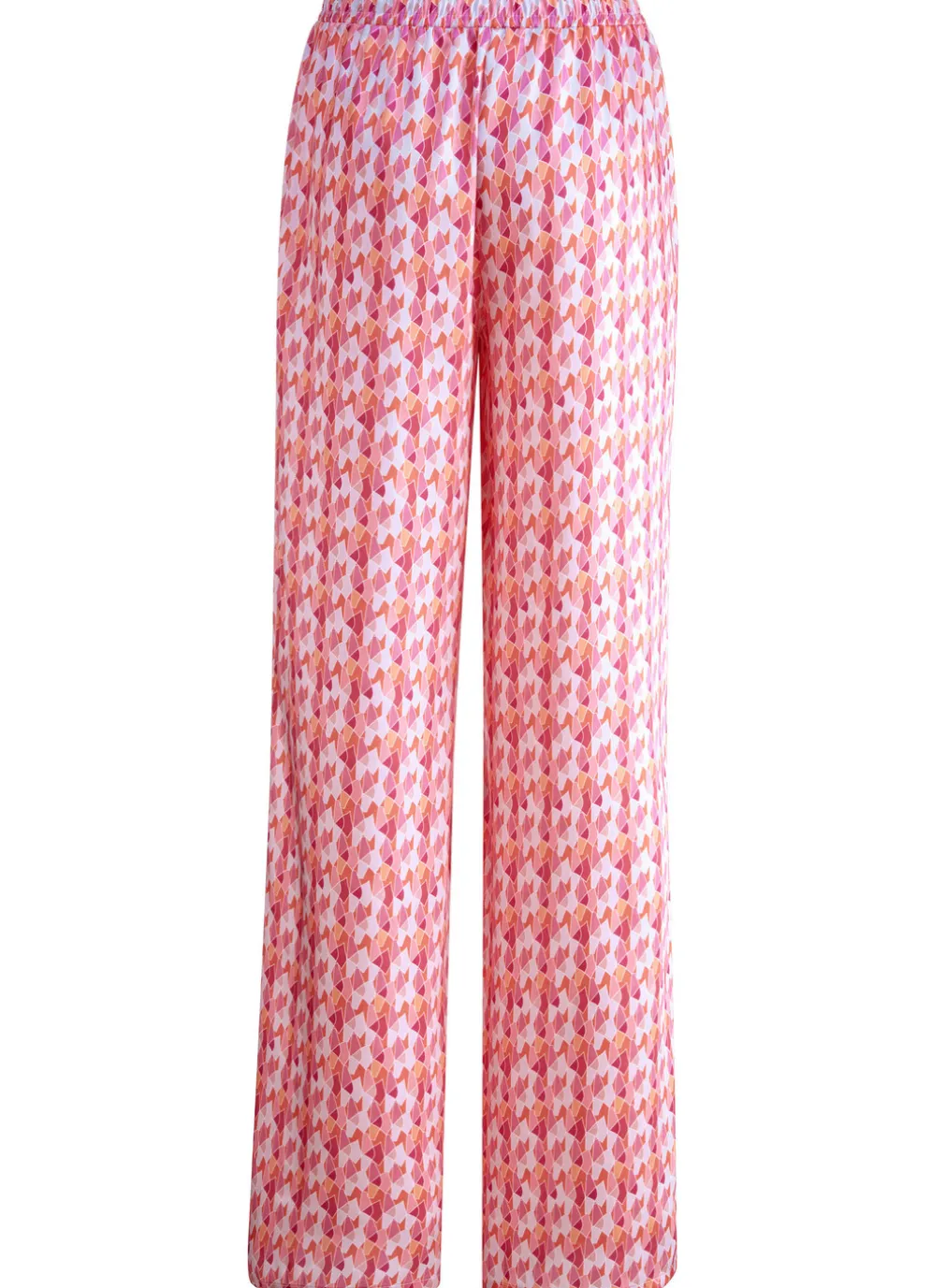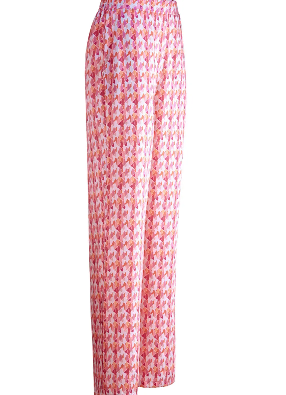 Faszinierende Hose von laurakent in modischer Weite und aktueller Minimaldessinierung mit farbbrillantem Druck in Orange-Pink-Bunt : bequeme Schlupfform, Dehnbund rundum mit vorderem, glattem Teilstück sowie Seitentaschen. Innenbeinlänge ca. 78 cm, Fußweite ab 52 cm.
