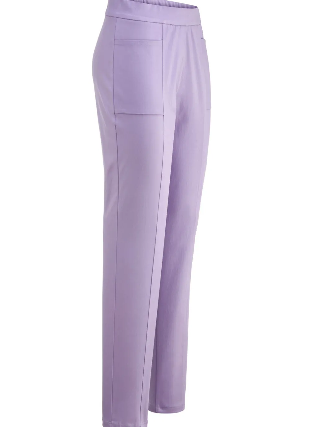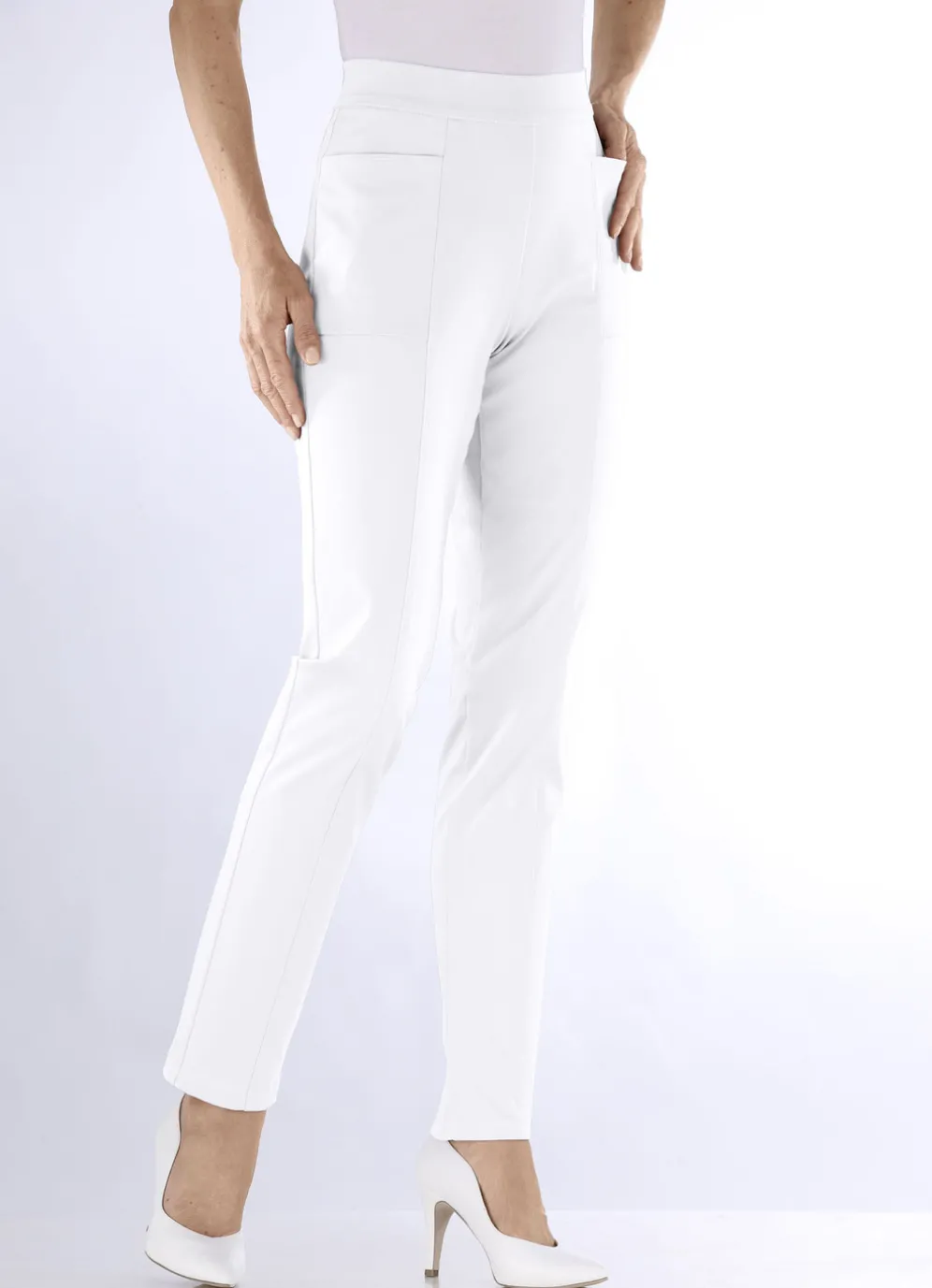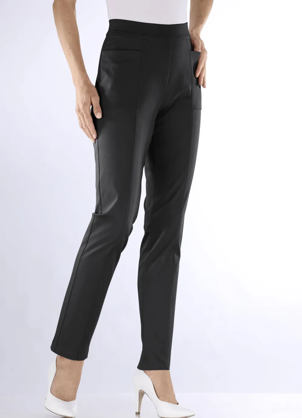 Ihr Modell BECKY-trendige Hose in Schlupfform: glatt anliegend dank der innenliegenden Gummibund-Einlage, aufgesetzte Seitentaschen, sowie vordere, abgesteppte Teilungsnähte. Innenbeinlänge ca. 78 cm, Fußweite ab 32 cm.