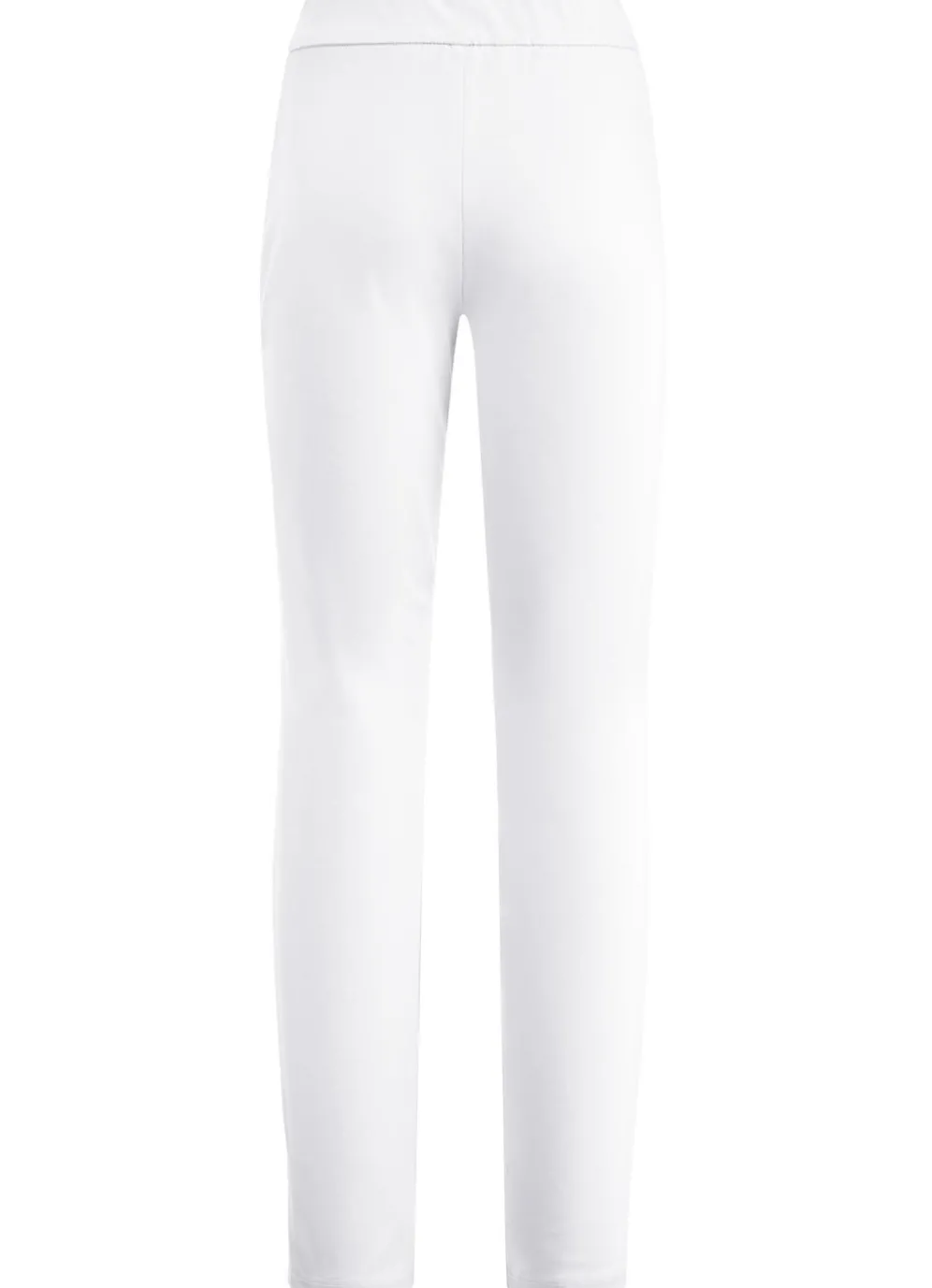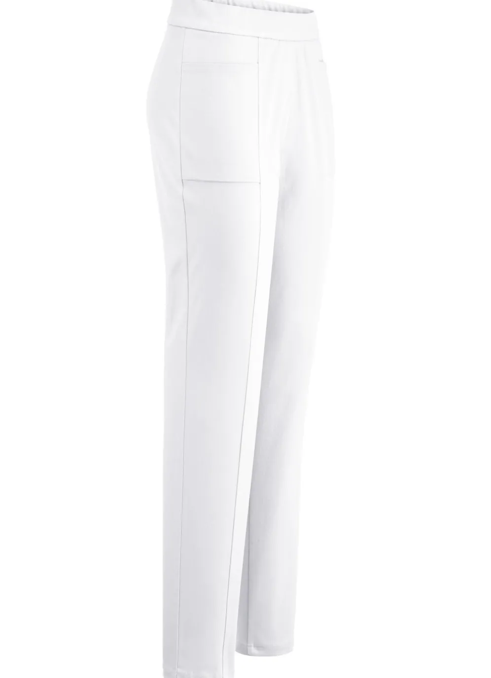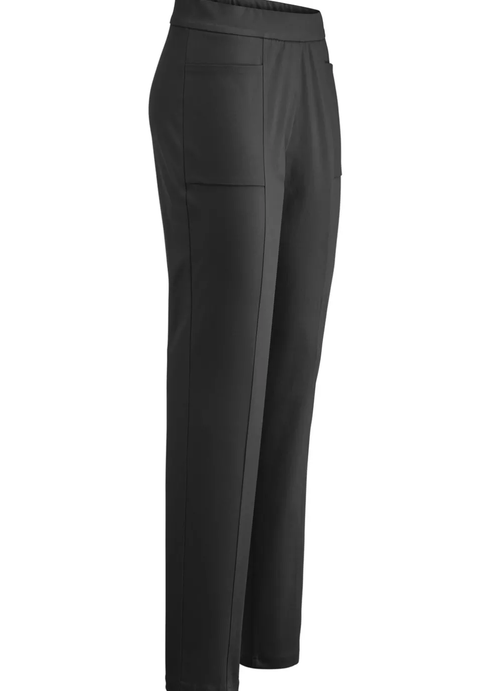 Ihr Modell BECKY-trendige Hose in Schlupfform: glatt anliegend dank der innenliegenden Gummibund-Einlage, aufgesetzte Seitentaschen, sowie vordere, abgesteppte Teilungsnähte. Innenbeinlänge ca. 78 cm, Fußweite ab 32 cm.