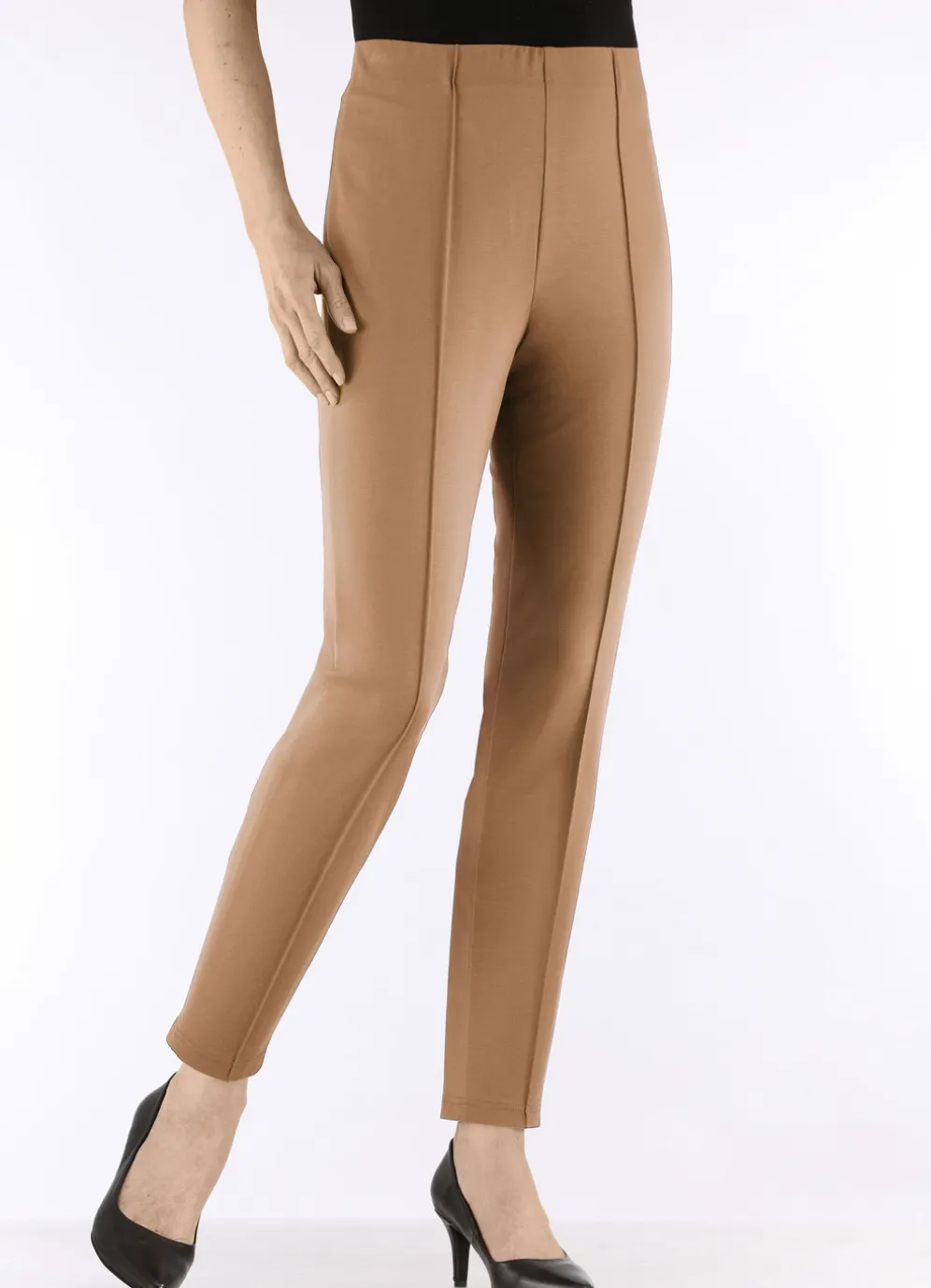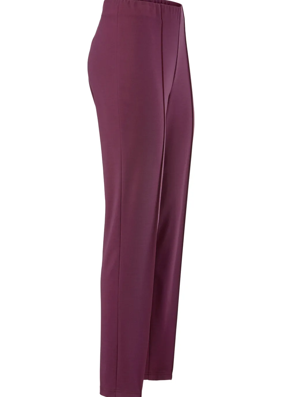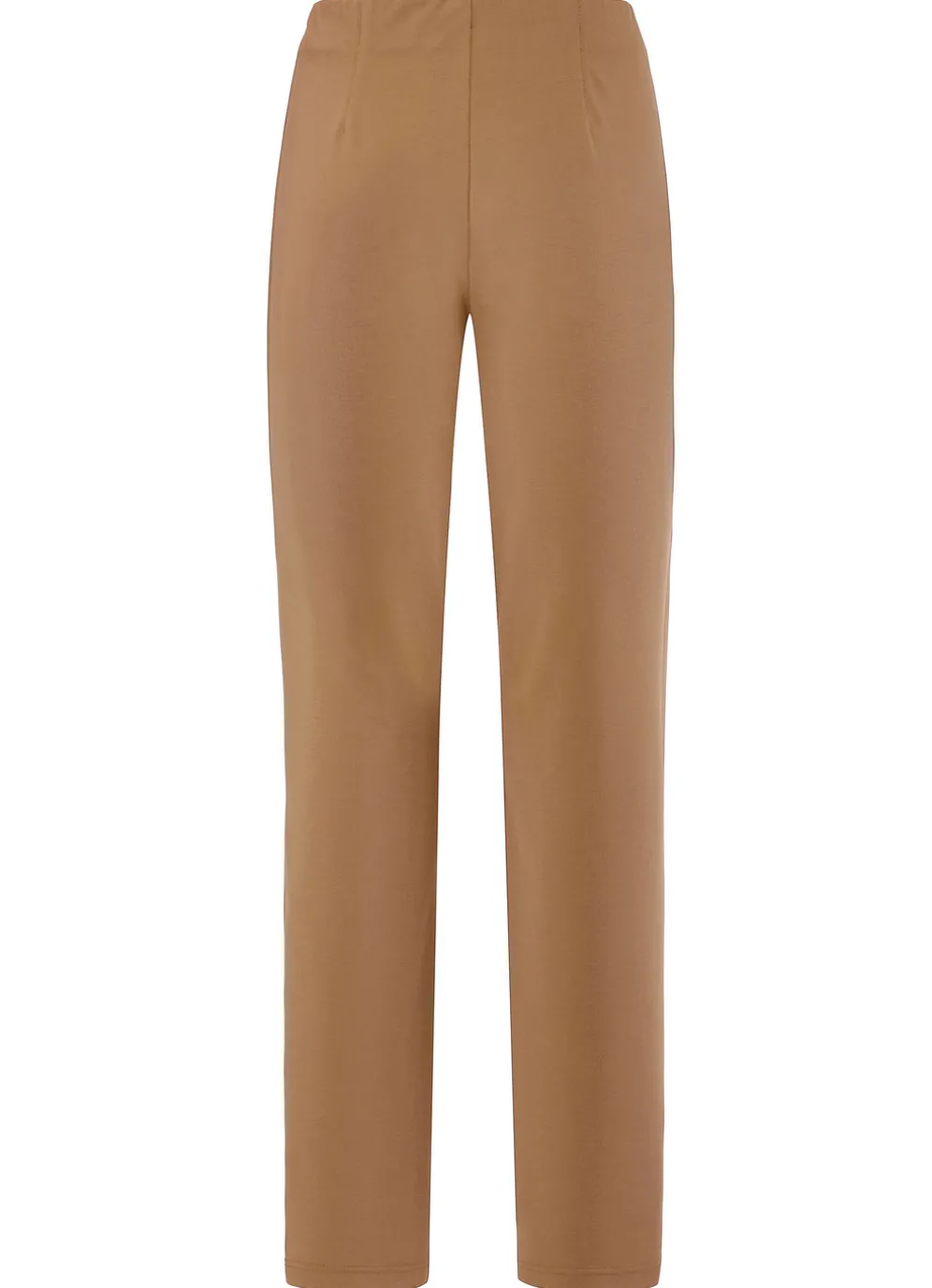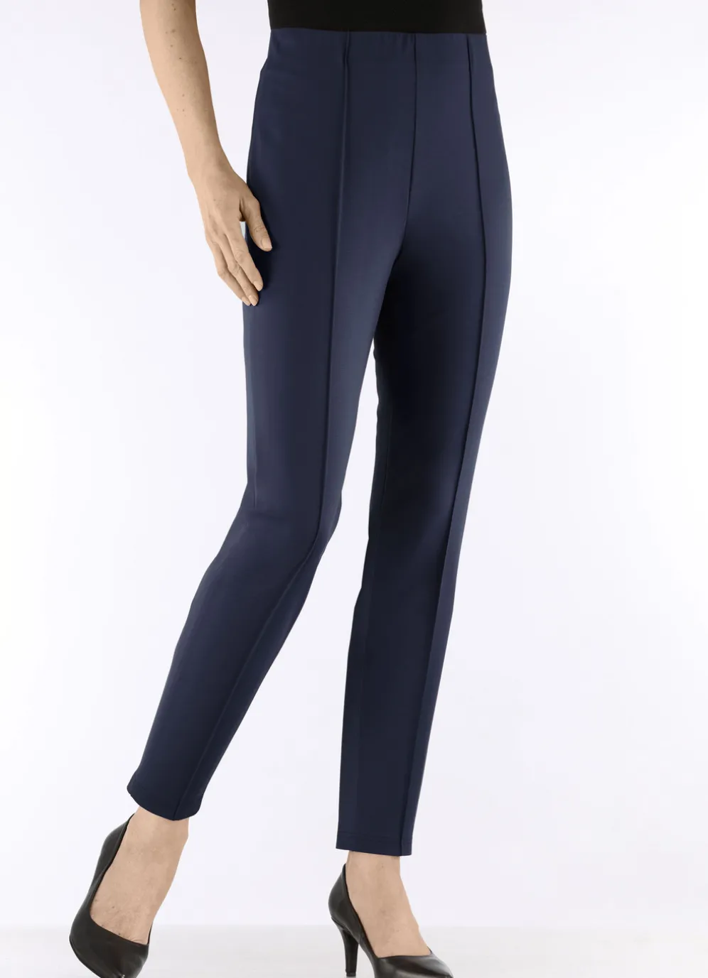 Knöchellange Hose mit angeschnittenem Bund, glatt anliegend dank der innenliegenden Gummibund-Einlage sowie abgesteppte Biesen im Vorderteil. Innenbeinlänge ca. 71 cm, Fußweite ab 30 cm.