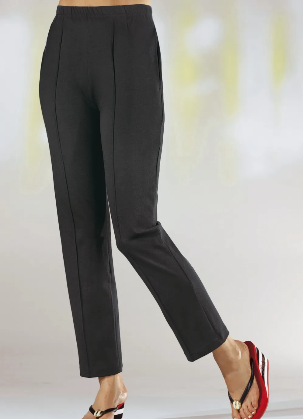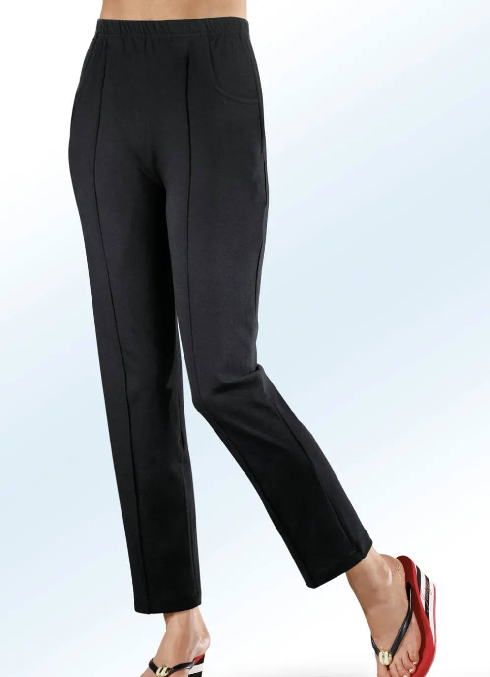 Flotte Hose in langer, gerader Form, mit bequemem Dehnbund rundum, zwei Schubtaschen sowie Biesenzier im Vorderteil.