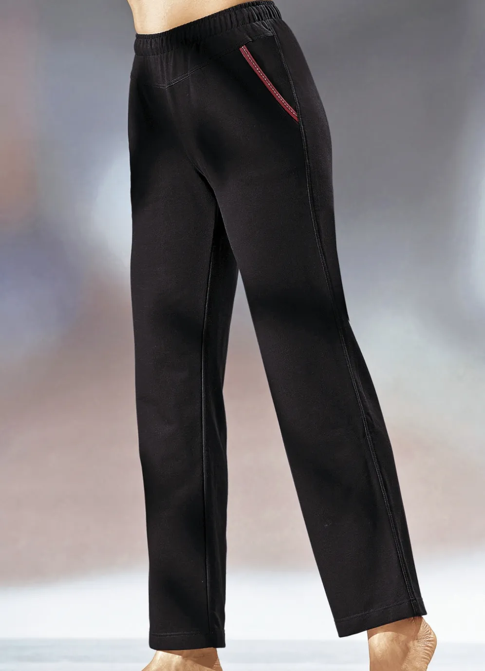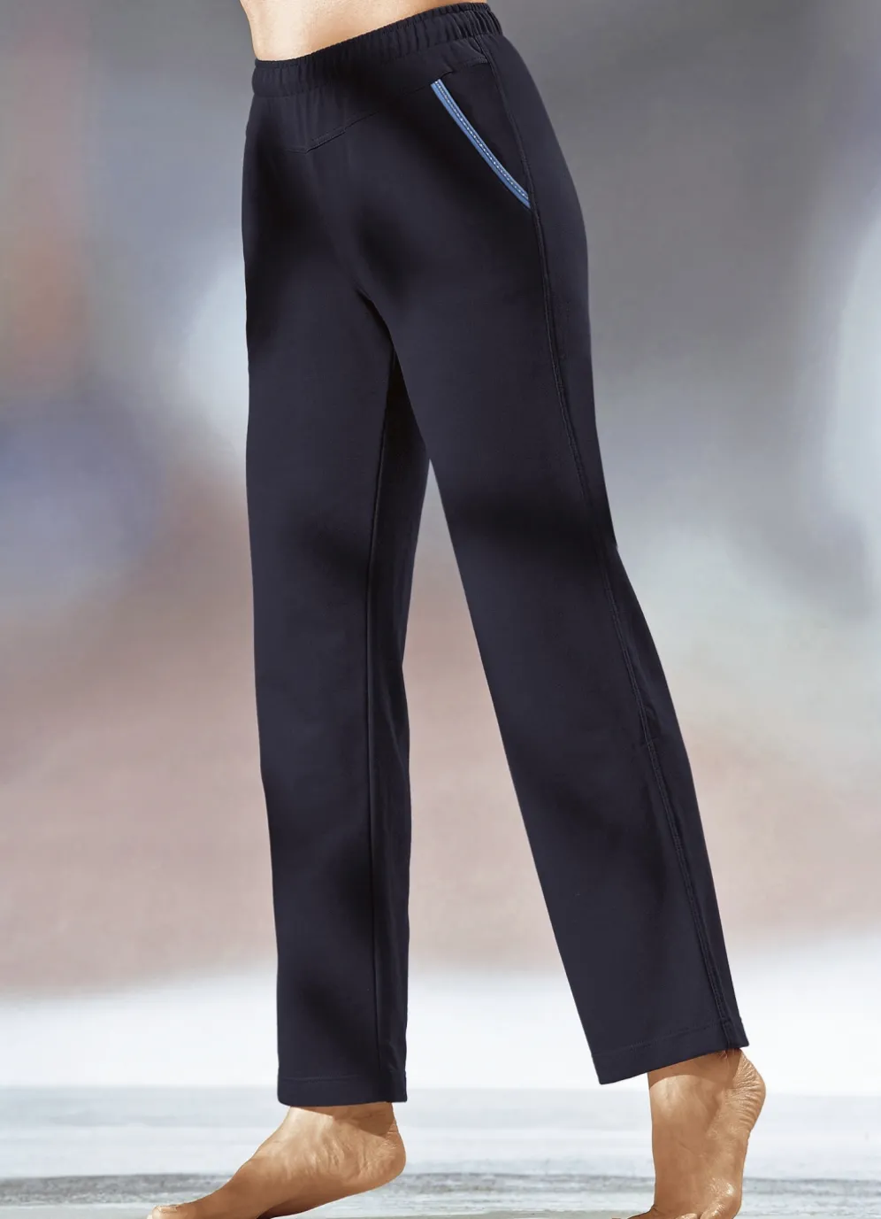 Schicke Hose in langer, gerader Form, mit Tunnelzugband am bequemem Dehnbund rundum sowie mit Glanzgarn besticktem Zierband an den beiden Seitennahttaschen.