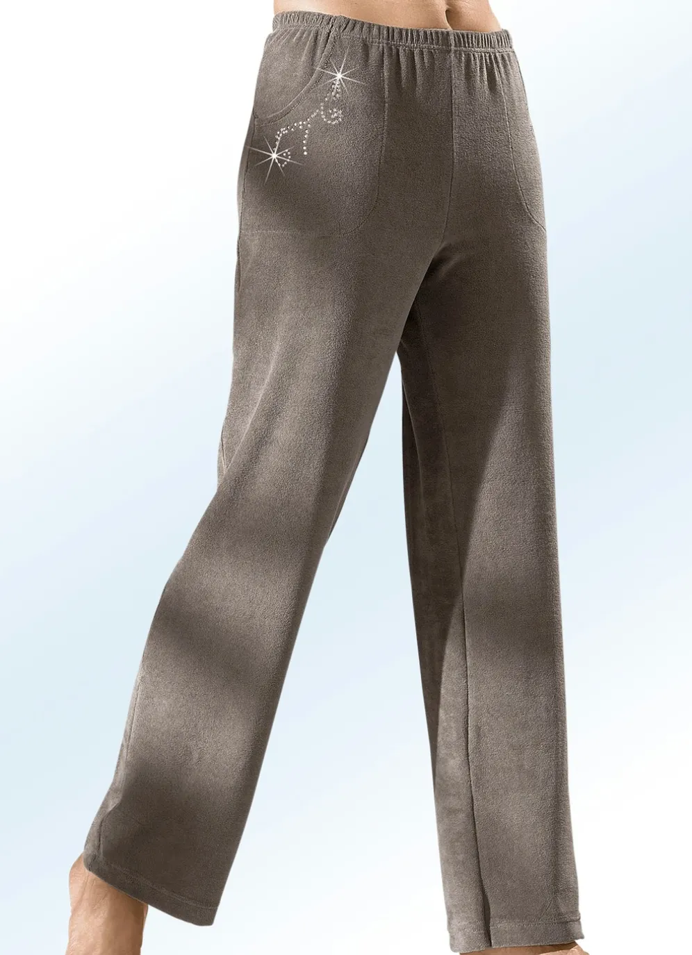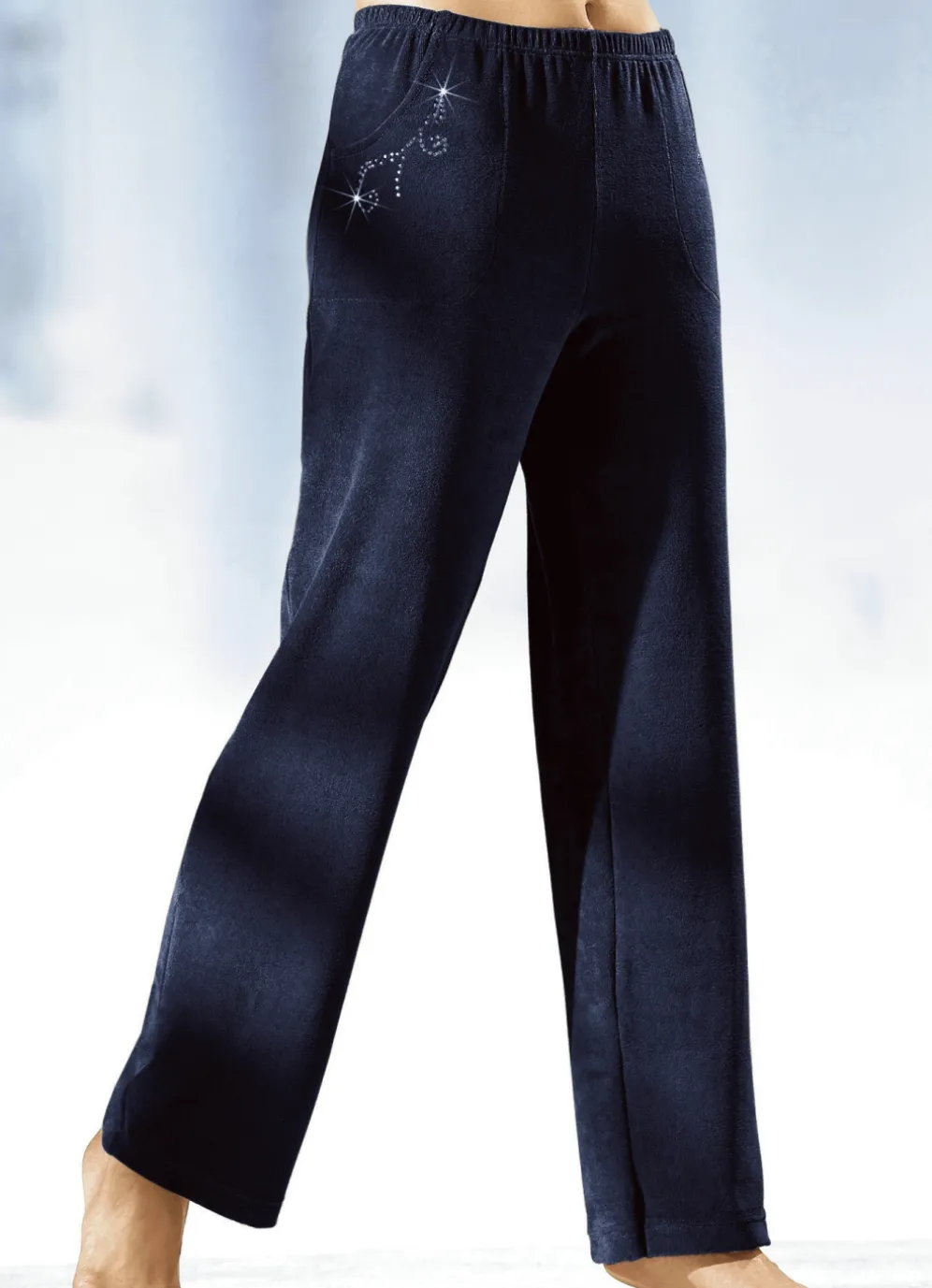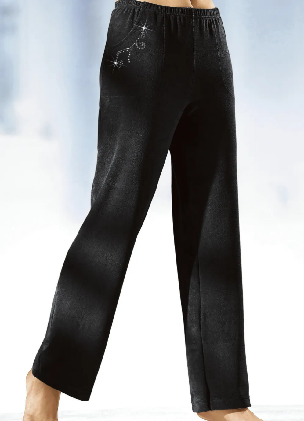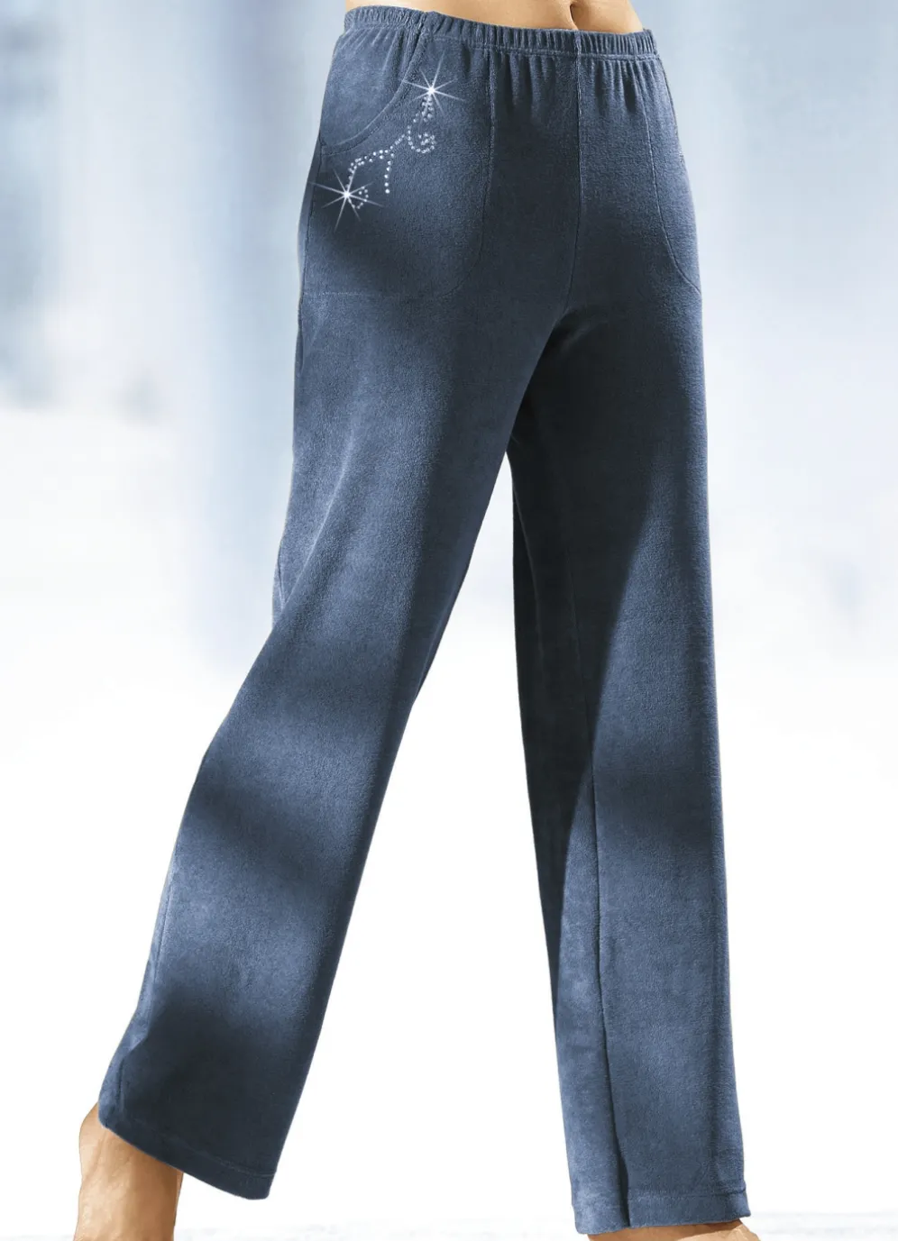 Tragangenehme Hose in langer, gerader Form, mit bequemem Dehnbund rundum sowie zwei Seitennahttaschen mit hübscher Schmucksteinzier.