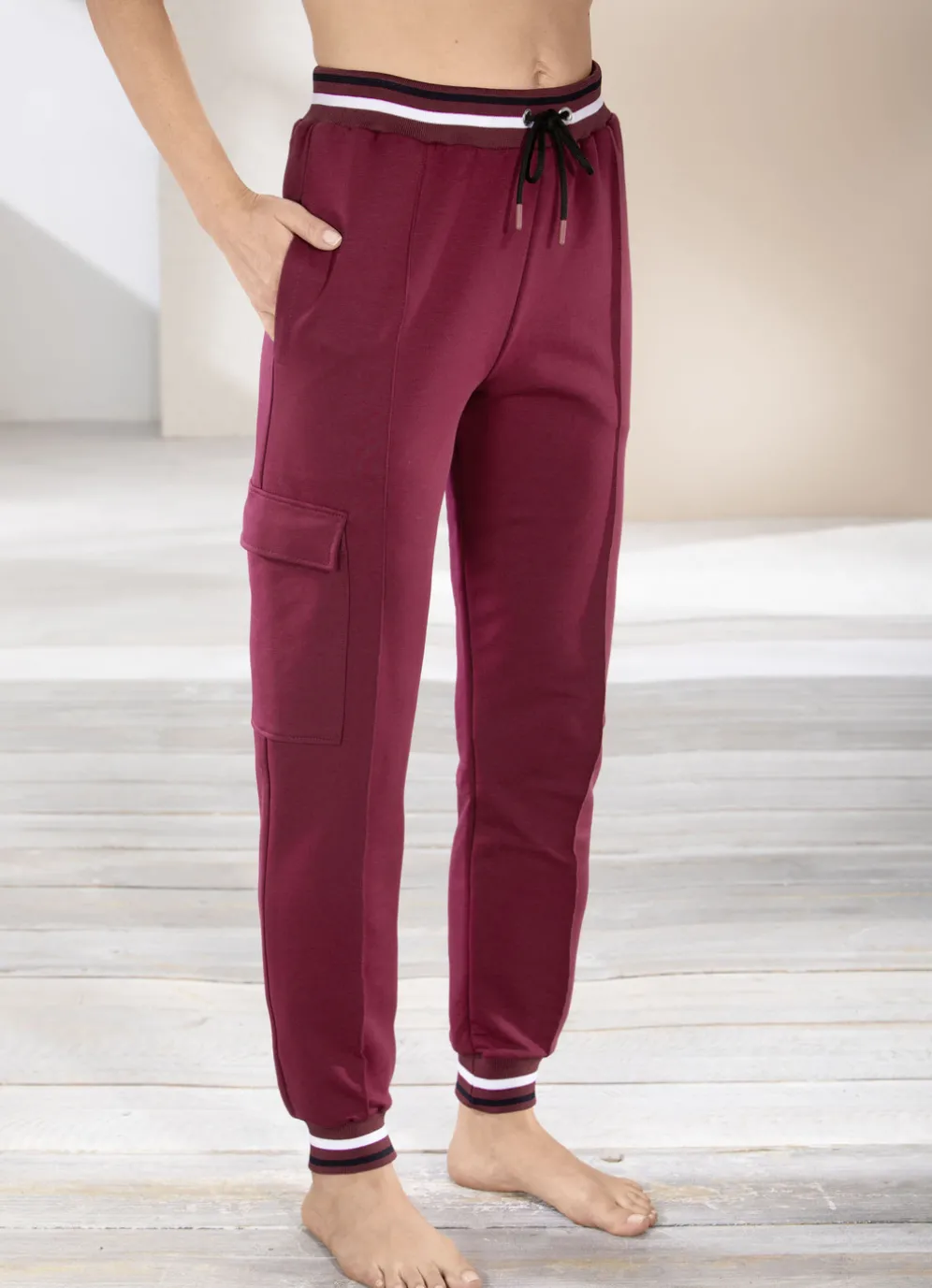 Praktische Hose von „Plantier” in langer Form, mit kontrastfarbenem Dehnbund rundum und Kordelzug, Biesenzier vorne, zwei Seitennahttaschen, eine Cargotasche auf der rechten Seite sowie breiten, kontrastfarbenen Bündchen an den Beinabschlüssen.