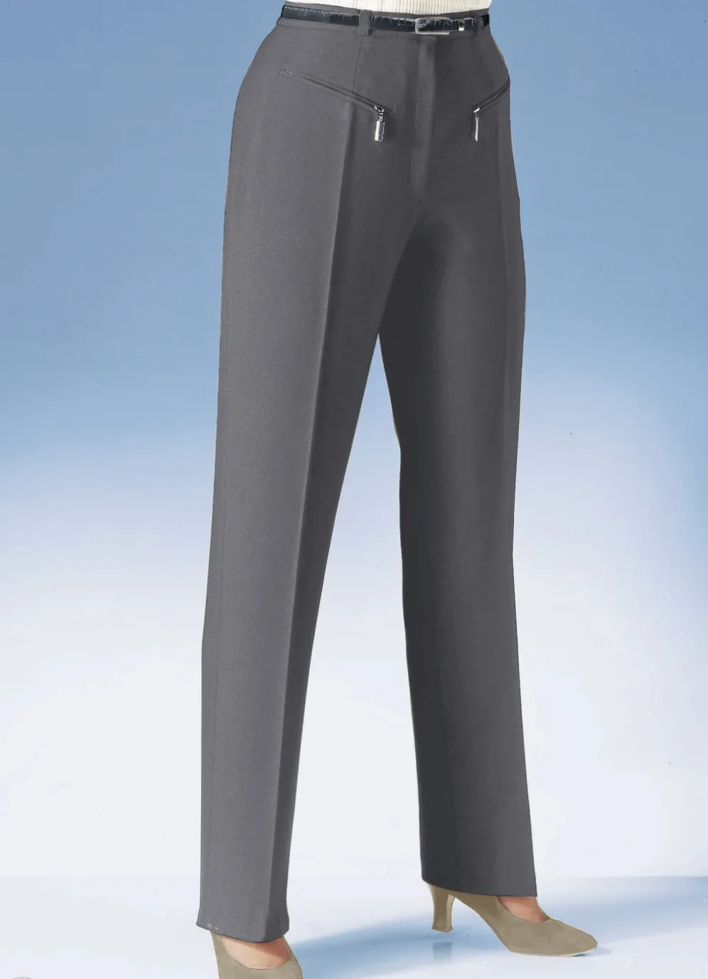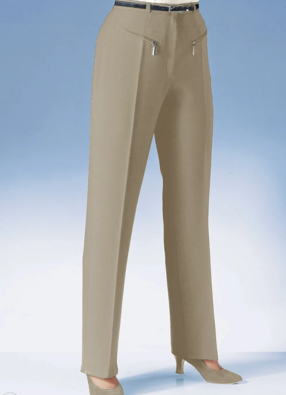 Ansprechende Hose mit Stretchbund, Gürtelschlaufen, Haken- und Reißverschluss, paspelierten Reißverschluss-Taschen mit Zieranhänger vorne. Innenbeinlänge ca. 76 cm, Fußweite ab 42 cm.