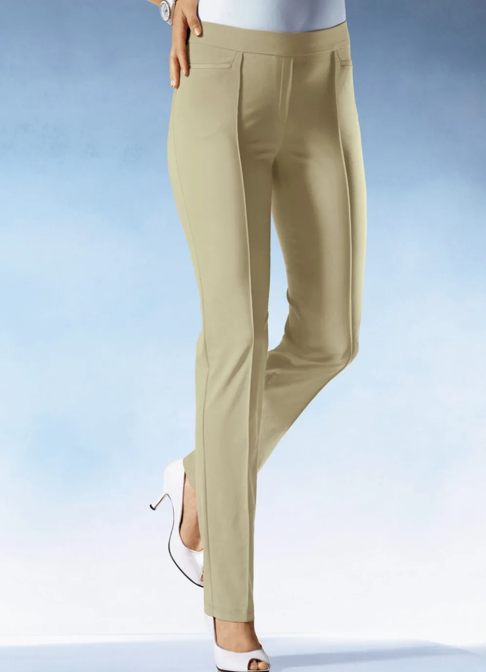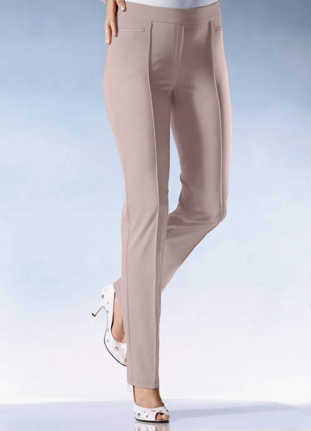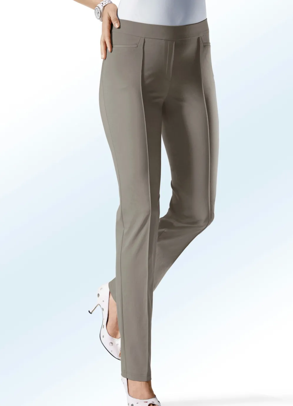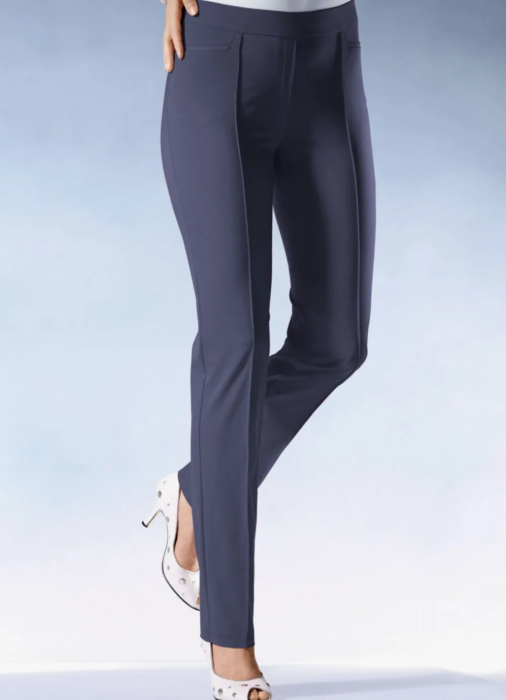 Trendstarke, hochelastische Hose mit modisch schmaler Fußweite: komfortable Schlupfform dank des innenliegenden, unsichtbaren Rundum-Dehnbundes, vordere Reißverschluss-Zierblende, paspelierte Seitentaschen sowie abgesteppte Biesen im Vorderteil, die für eine schlanke Silhouette sorgen. Innenbeinlänge ca. 78 cm, Fußweite ab 36 cm.