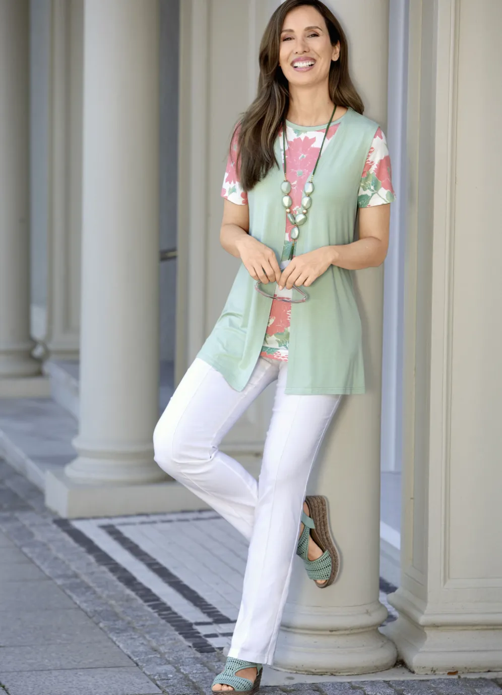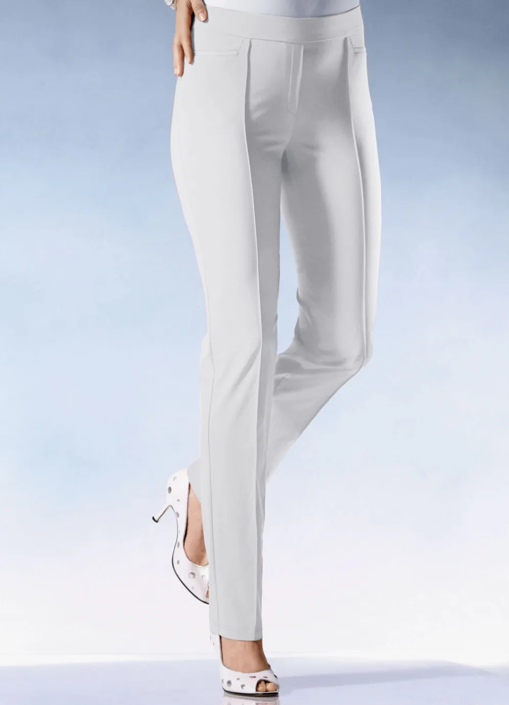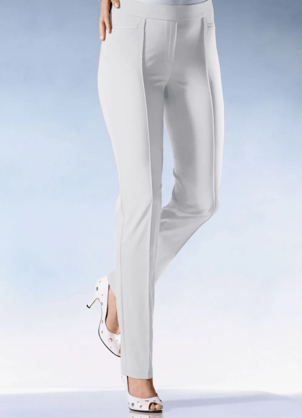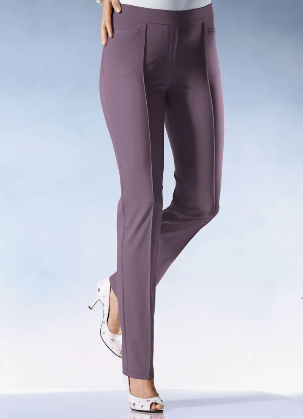 Trendstarke, hochelastische Hose mit modisch schmaler Fußweite: komfortable Schlupfform dank des innenliegenden, unsichtbaren Rundum-Dehnbundes, vordere Reißverschluss-Zierblende, paspelierte Seitentaschen sowie abgesteppte Biesen im Vorderteil, die für eine schlanke Silhouette sorgen. Innenbeinlänge ca. 78 cm, Fußweite ab 36 cm.