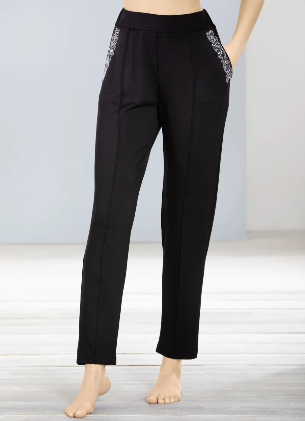 Komfortable „Plantier“-Hose in langer Form, mit breitem Dehnbund rundum, hübscher Schmucksteinzier an den zwei Schubtaschen.
