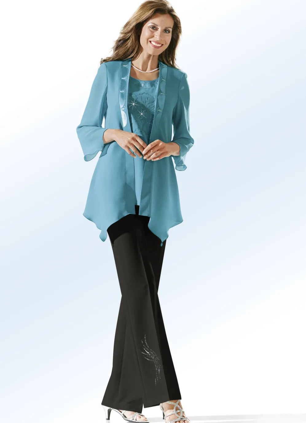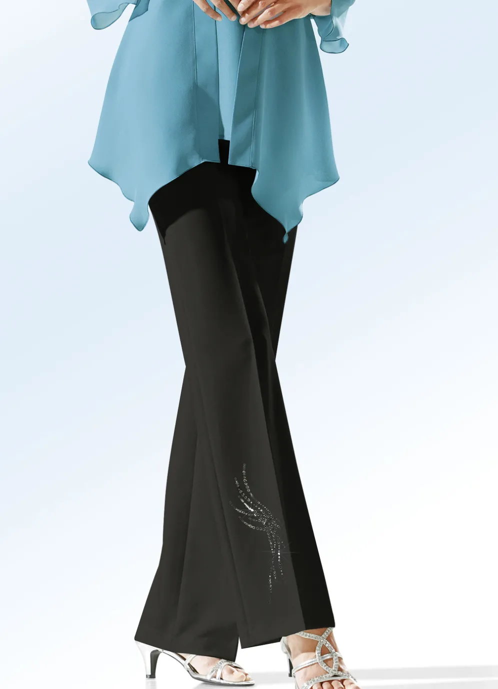 Elegante Hose in angesagter Marlene-Form, mit Stretchbund, ab Gr. 44, 22 bzw. 88 mit rückwärtigen Dehnbundeinsätzen, Haken- und Reißverschluss sowie schmückendem Strasszier-Motiv an einem Beinabschluss. Innenbeinlänge ca. 79 cm, Fußweite ab 54 cm.