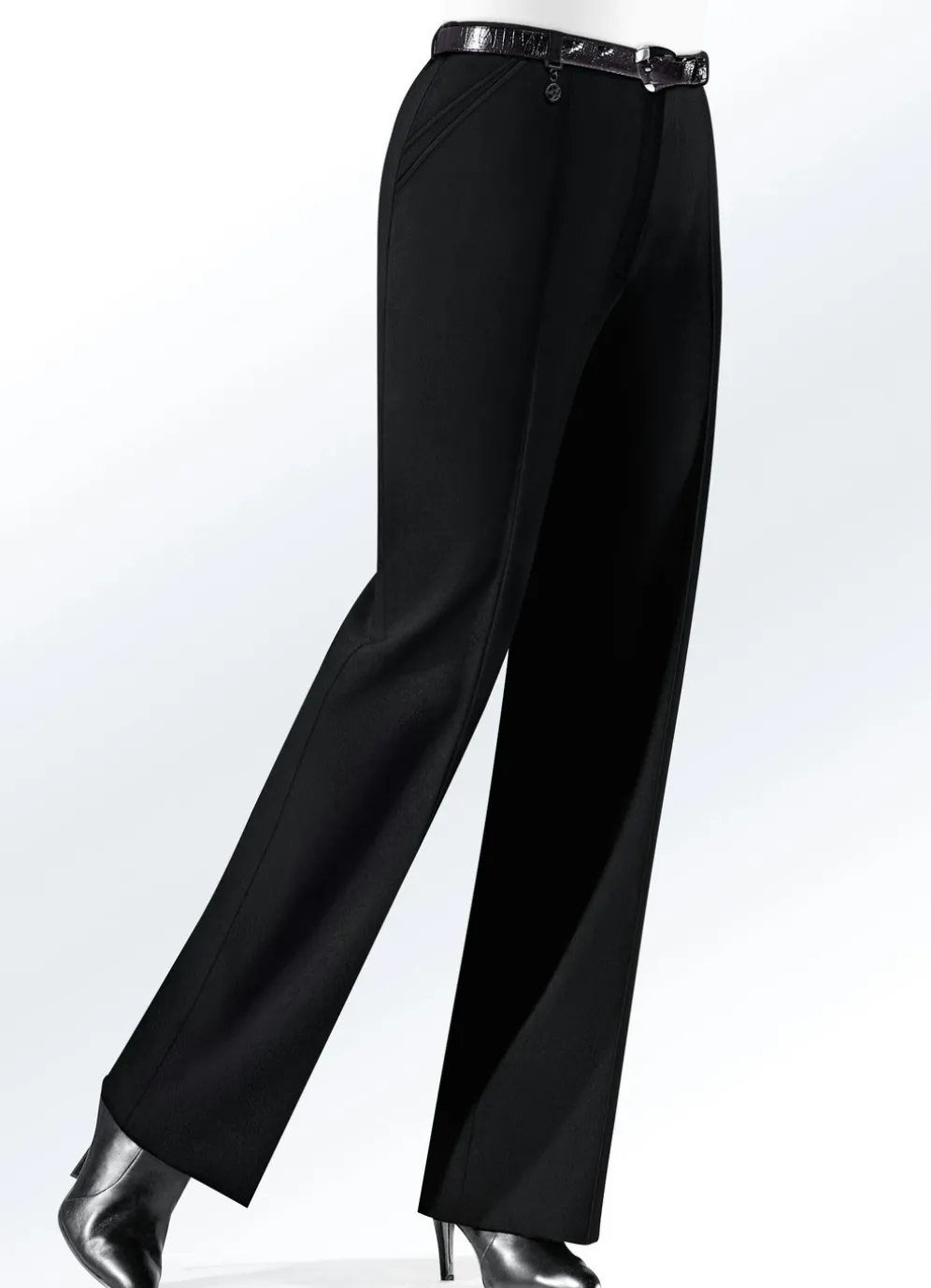 In bester Qualität und Verarbeitung zeigt sich diese attraktive Hose mit modisch ausgestellter Fußweite: rückwärtige Dehnbundeinsätze, aparter Zieranhänger an einer der vorderen Gürtelschlaufen, Haken- und Reißverschluss sowie Seitentaschen mit interessantem Blenden-Effekt. Innenbeinlänge ca. 79 cm, Fußweite ab 54 cm.