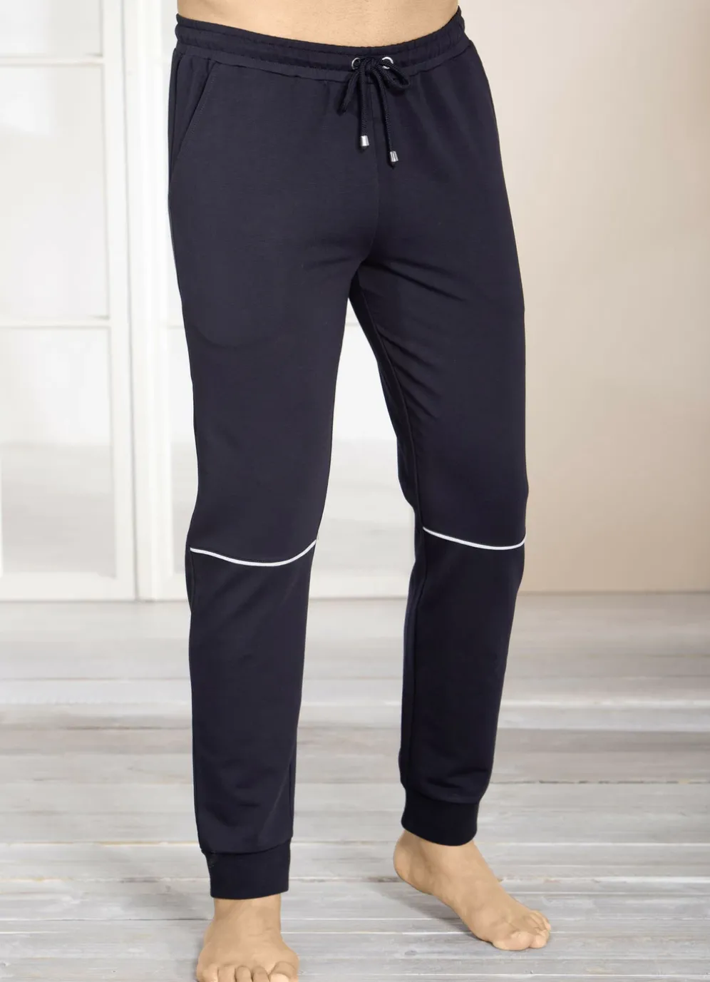 Tragangenehme Hose in langer, gerader Form, mit Dehnbund rundum und Tunnelzugband, zwei Schubtaschen, Zierpaspel im mittleren Beinbereich sowie breite Bündchen an den Beinabschlüssen.